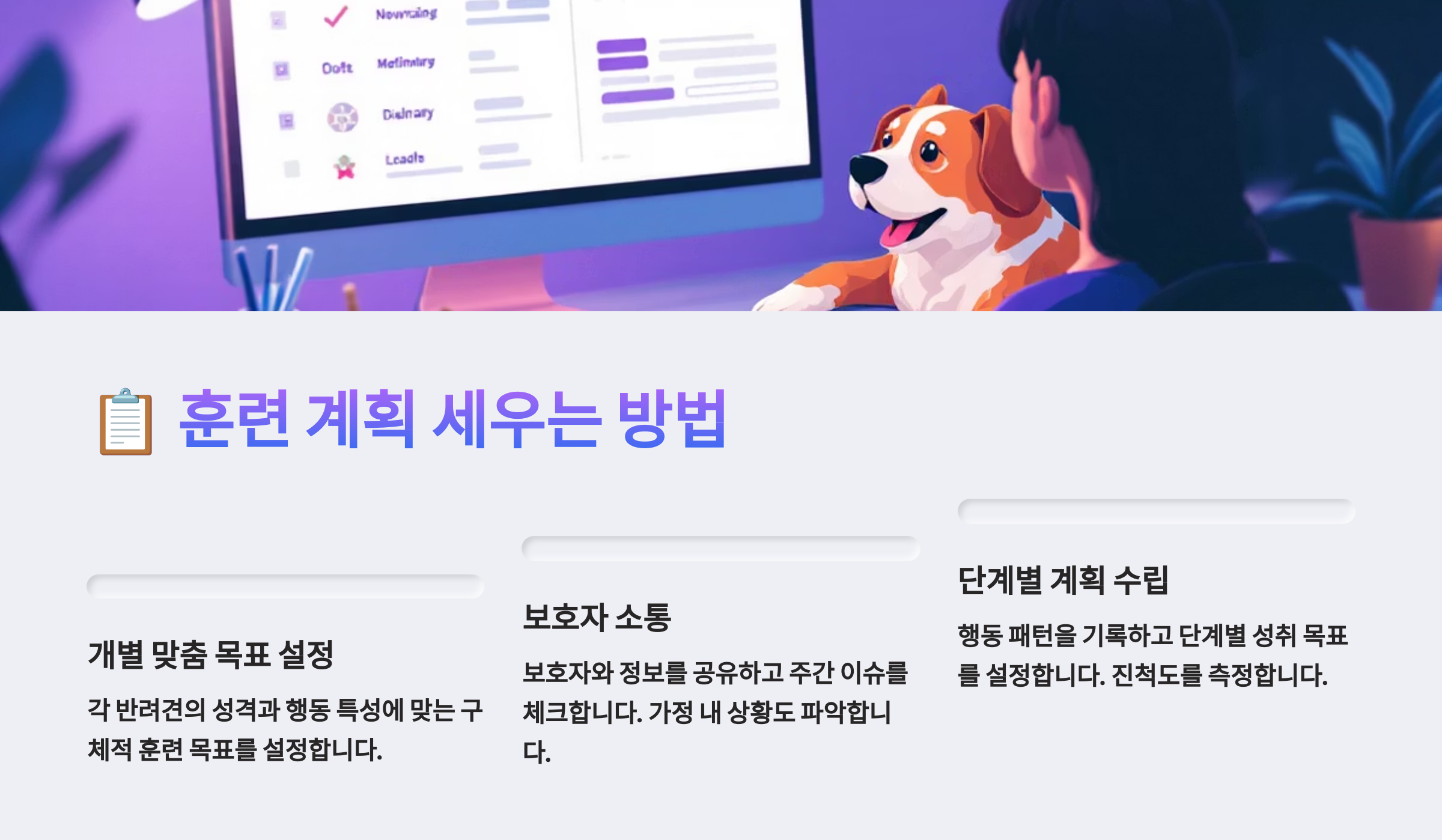 훈련사는 이 훈련 계획을 바탕으로 매일매일의 미션을 정하고, 보호자와 공유해요. 즉, 훈련사는 단순한 지도자가 아니라 함께 해주는 코디네이터의 역할까지 수행하는 거예요. 🤝📅