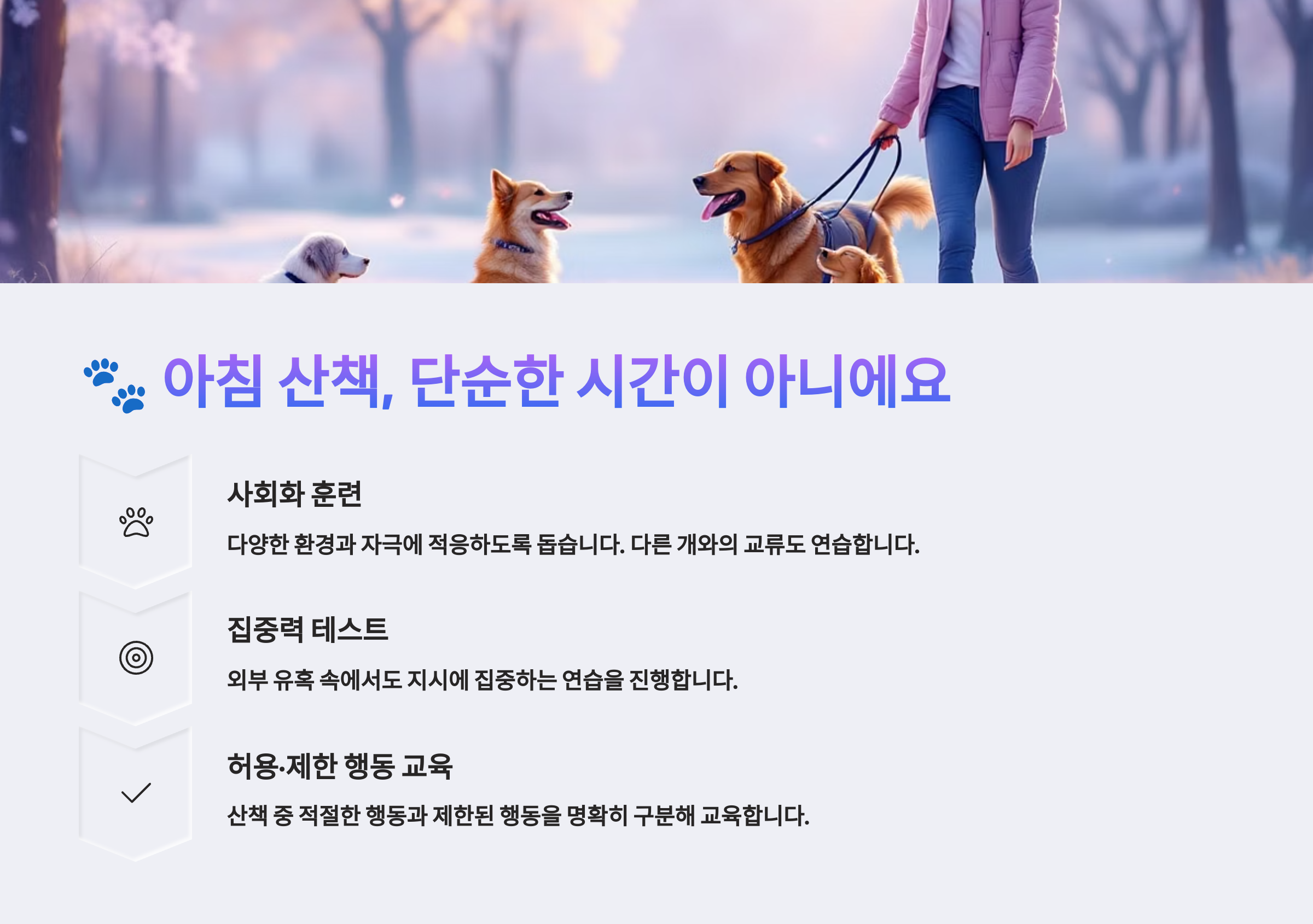 많은 사람들이 반려동물 훈련사의 아침 산책을 그냥 산책을 함께 나가는 시간 정도로 생각해요. 하지만 훈련사에게 아침 산책은 분석의 시간, 대화의 시간, 학습의 시간이에요. 매일의 산책이 훈련의 첫 단추라는 거, 알고 계셨나요? 🐶🧠