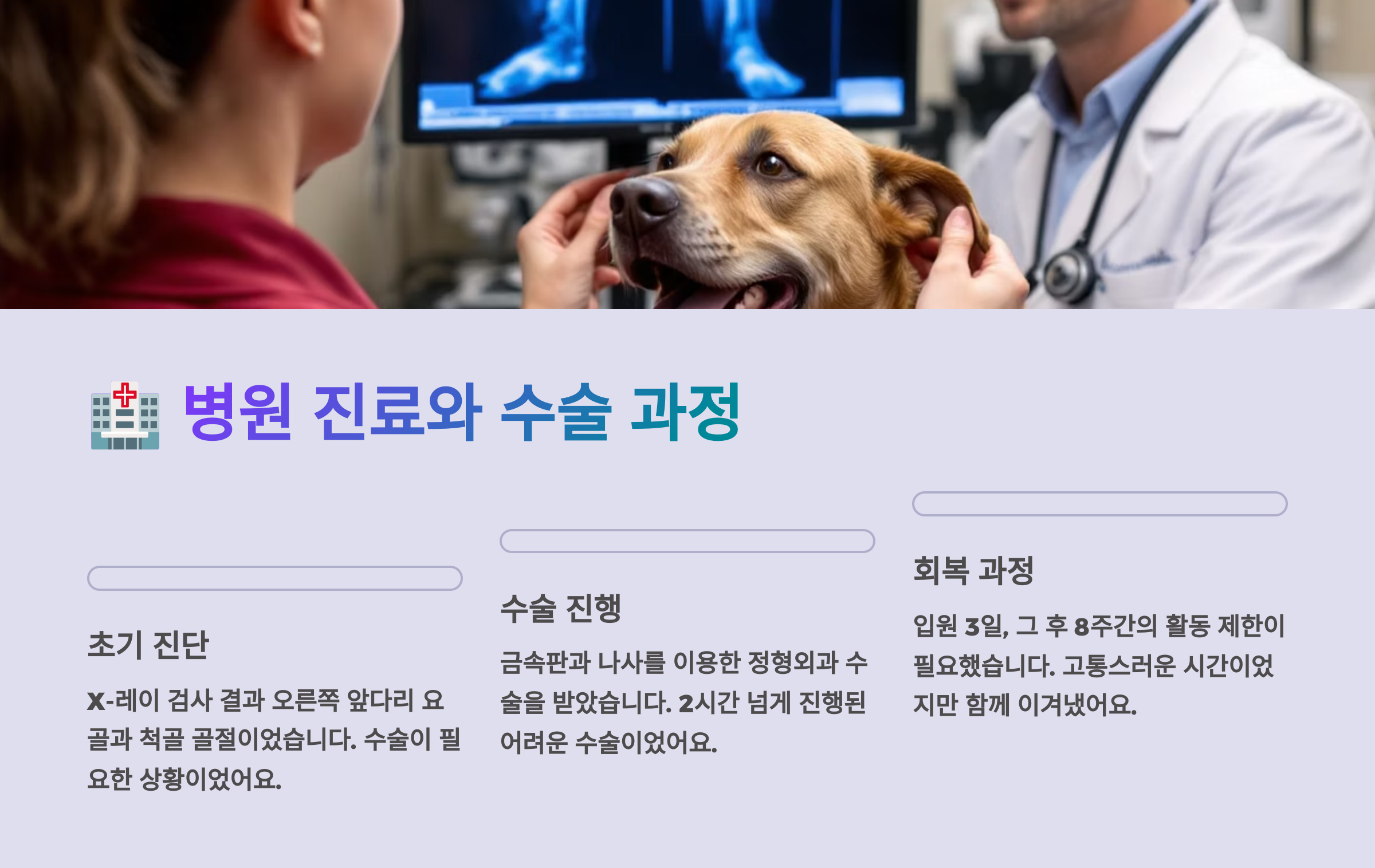수술을 포기하면 당장은 돈을 아낄 수 있을지도 몰라요. 하지만 회복이 불완전하게 되면 평생 절뚝거리거나, 통증을 안고 살아갈 수 있어요. 강아지도 아프고, 보호자도 계속 마음 아픈 상황이 이어지는 거죠. 😢