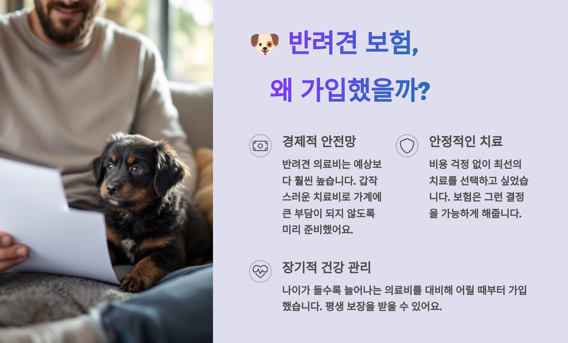 그냥 건강하게 오래오래 같이 살고 싶다는 마음뿐이었죠. 그런데 주변에서 아픈 강아지들 이야기를 들으면서 생각이 바뀌기 시작했어요. 특히 진료비가 엄청나다는 얘기에 깜짝 놀랐답니다.