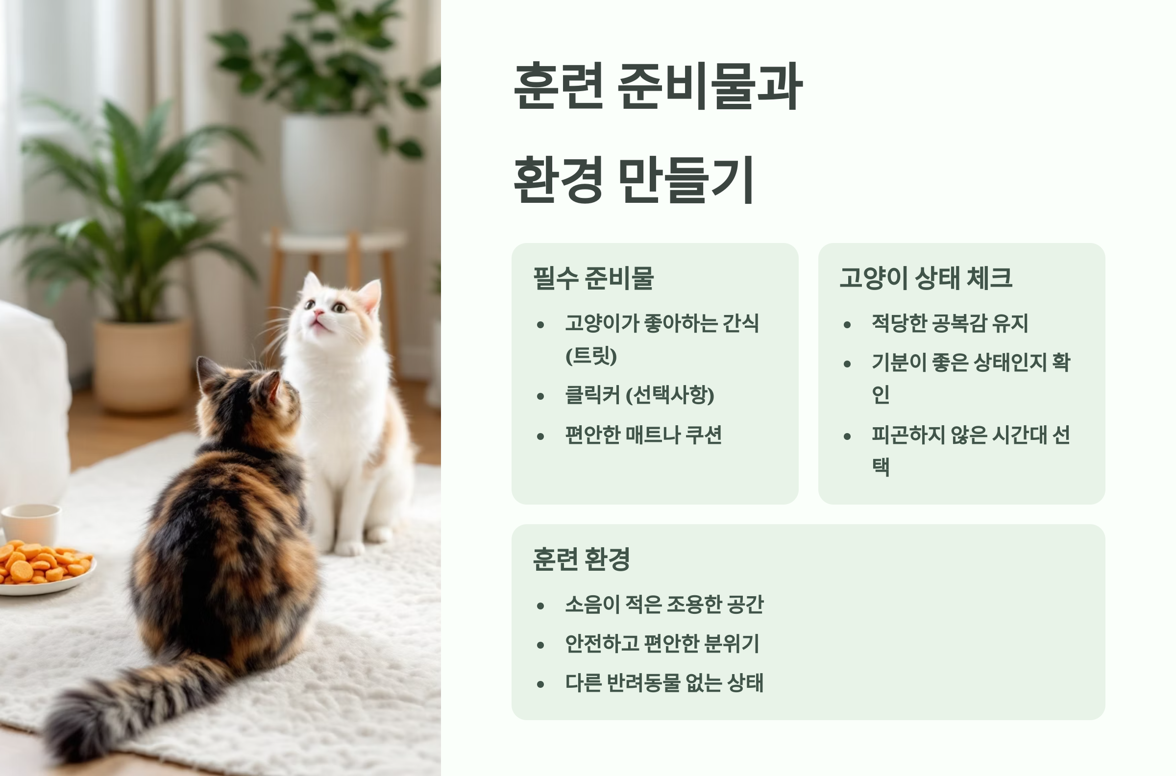 고양이는 예민한 동물이기 때문에 편안하고 익숙한 환경에서 훈련해야 스트레스를 받지 않아요. 🌿😺
