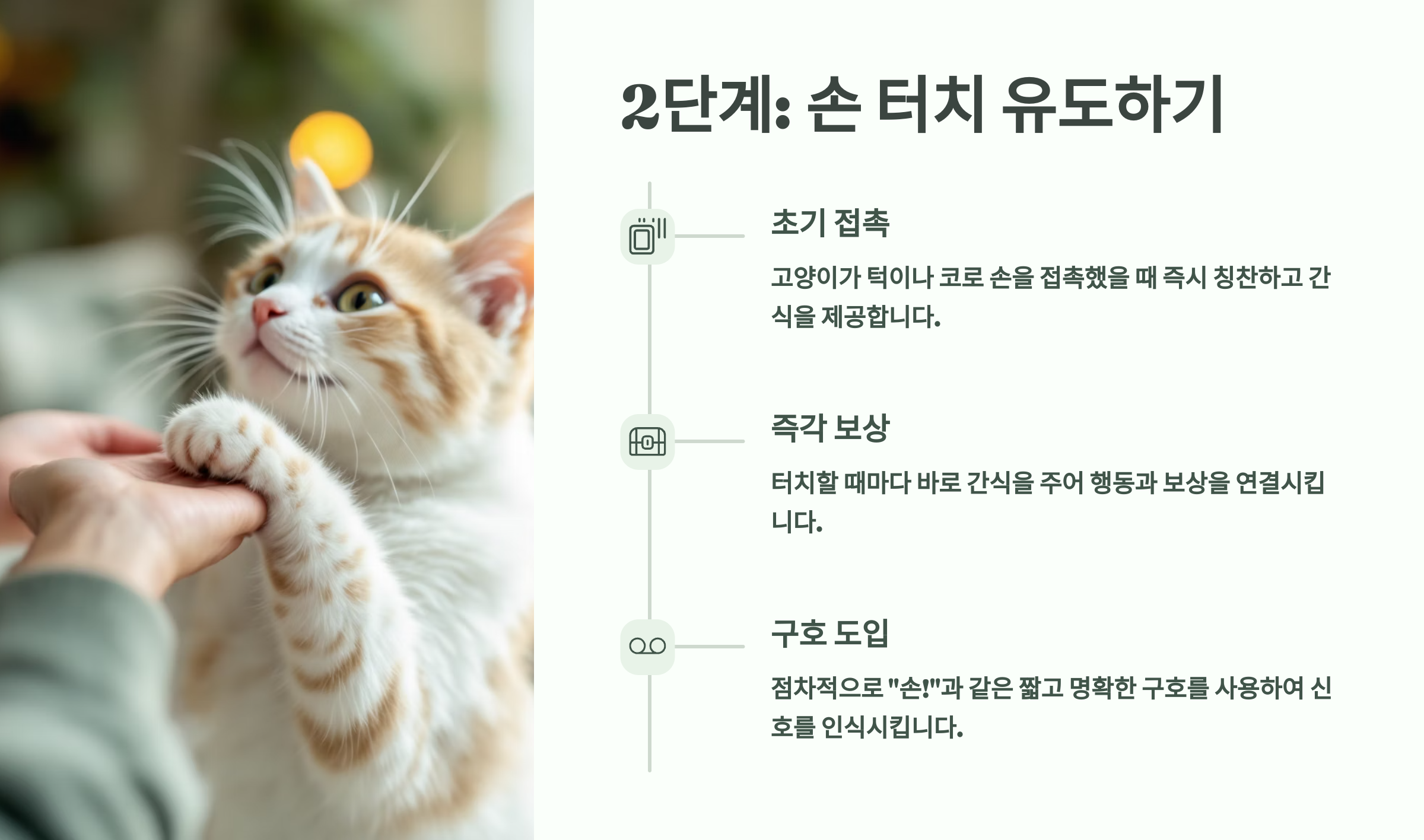 이제 손에 자연스럽게 반응하는 고양이를 향해 다음 단계, 터치 유도 훈련을 진행해볼게요! 🖐️🐾