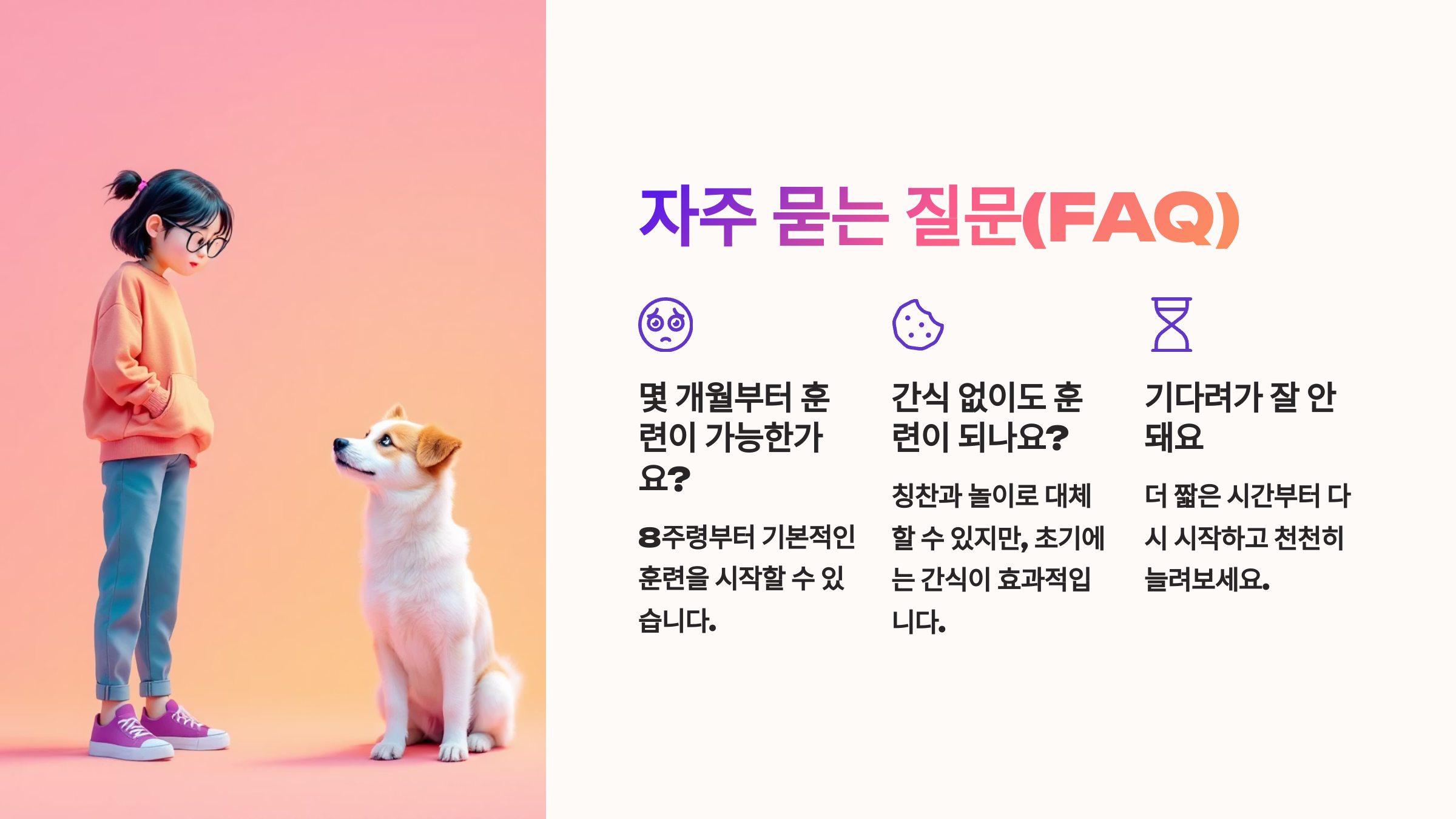 훈련은 무조건 어렵고 긴 시간이 걸린다고 생각할 수 있지만, 하루 10분만 꾸준히 투자하면 충분히 가능해요. 보호자와의 신뢰가 쌓이면 강아지는 스스로 집중하고 따라하려고 해요. 훈련은 혼내는 게 아니라, 재미있게 배우는 놀이가 되어야 해요!