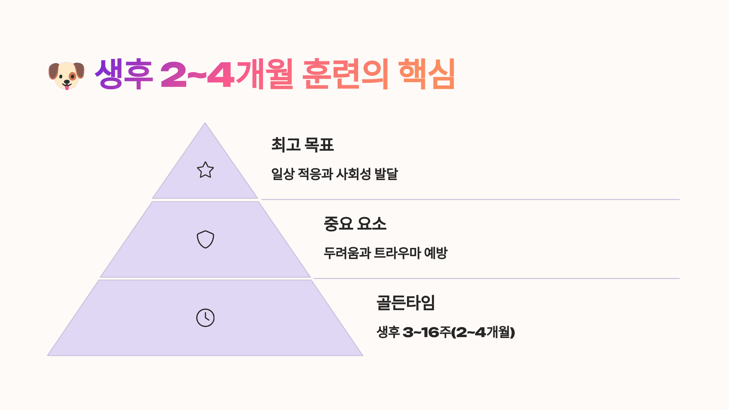 💡 가장 효과적인 훈련 시기는 생후 8주~16주 사이예요. 이 시기의 아이들은 흡수력, 순응도, 학습 속도가 정말 빨라요!