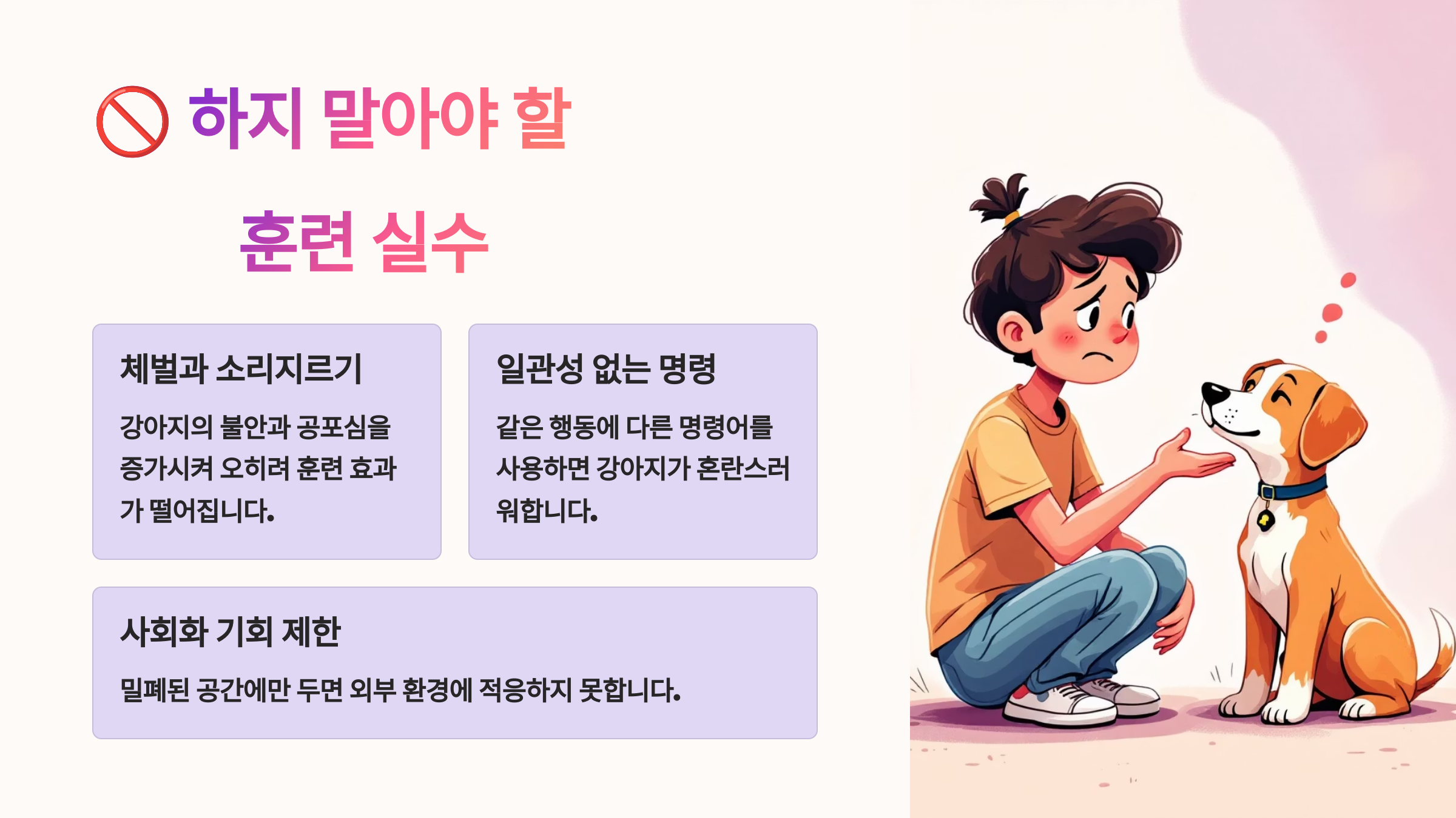 ⛔ 소리 지르기 강아지는 톤과 감정에 민감해요. 크게 화내면 무섭기만 하고, 행동의 이유를 이해 못 해요.