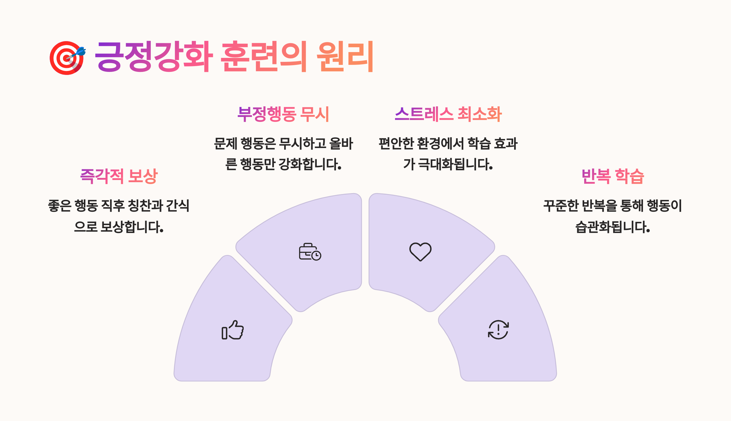 📌 포인트는 타이밍과 반복! 행동 후 1~2초 내 보상 하루에 여러 번 같은 조건으로 반복해주는 게 핵심이에요.
