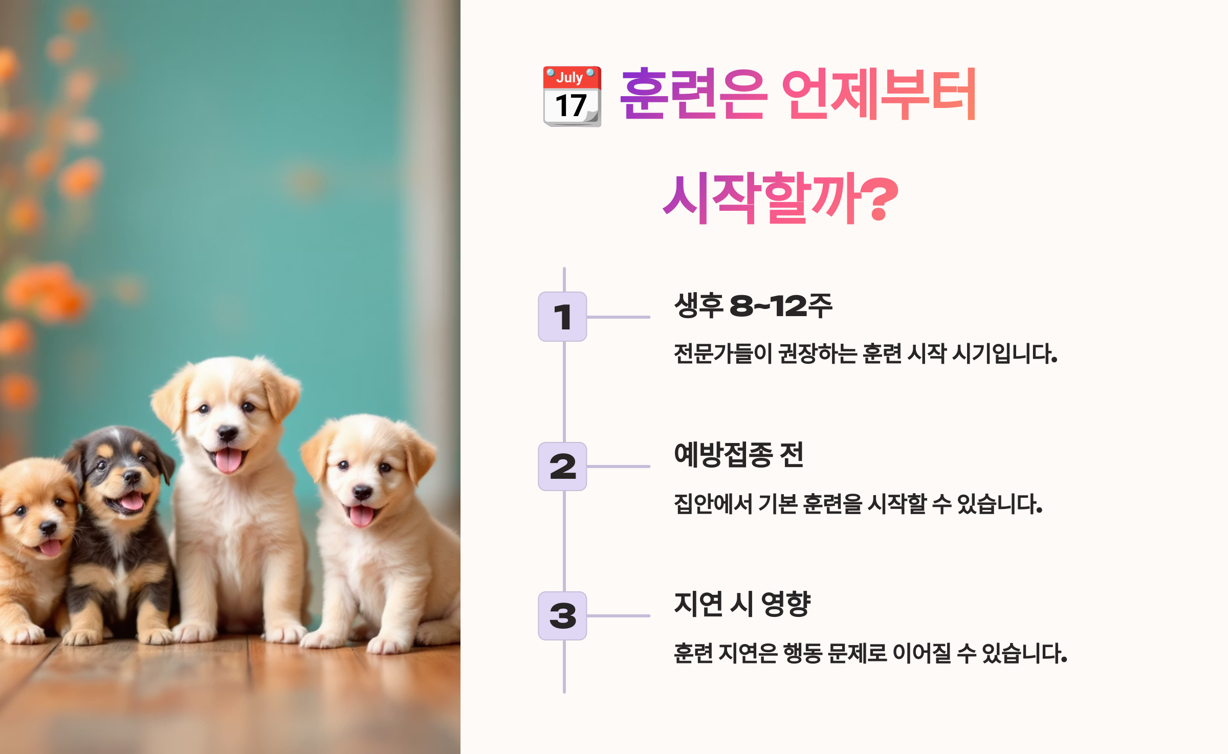 A1. 생후 8주부터 가능해요! 이 시기가 뇌발달 + 사회화 + 습관 형성의 황금기라 가장 효과적이에요.