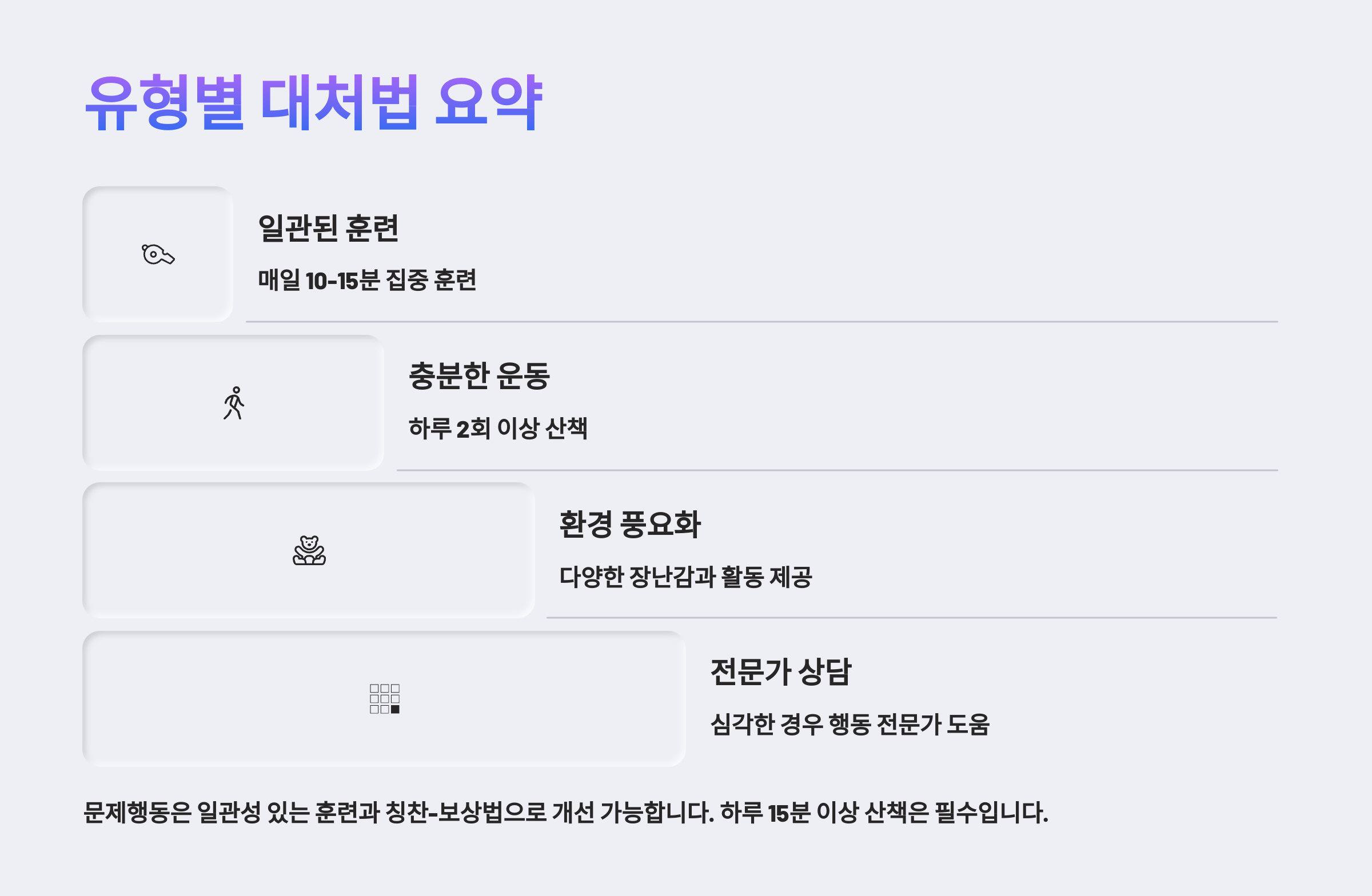 이제 다음은 📌 유형별 대처법 요약 섹션이에요! TOP5 문제행동별 핵심 훈련 포인트만 쏙쏙 정리해드릴게요. 🧠📄
