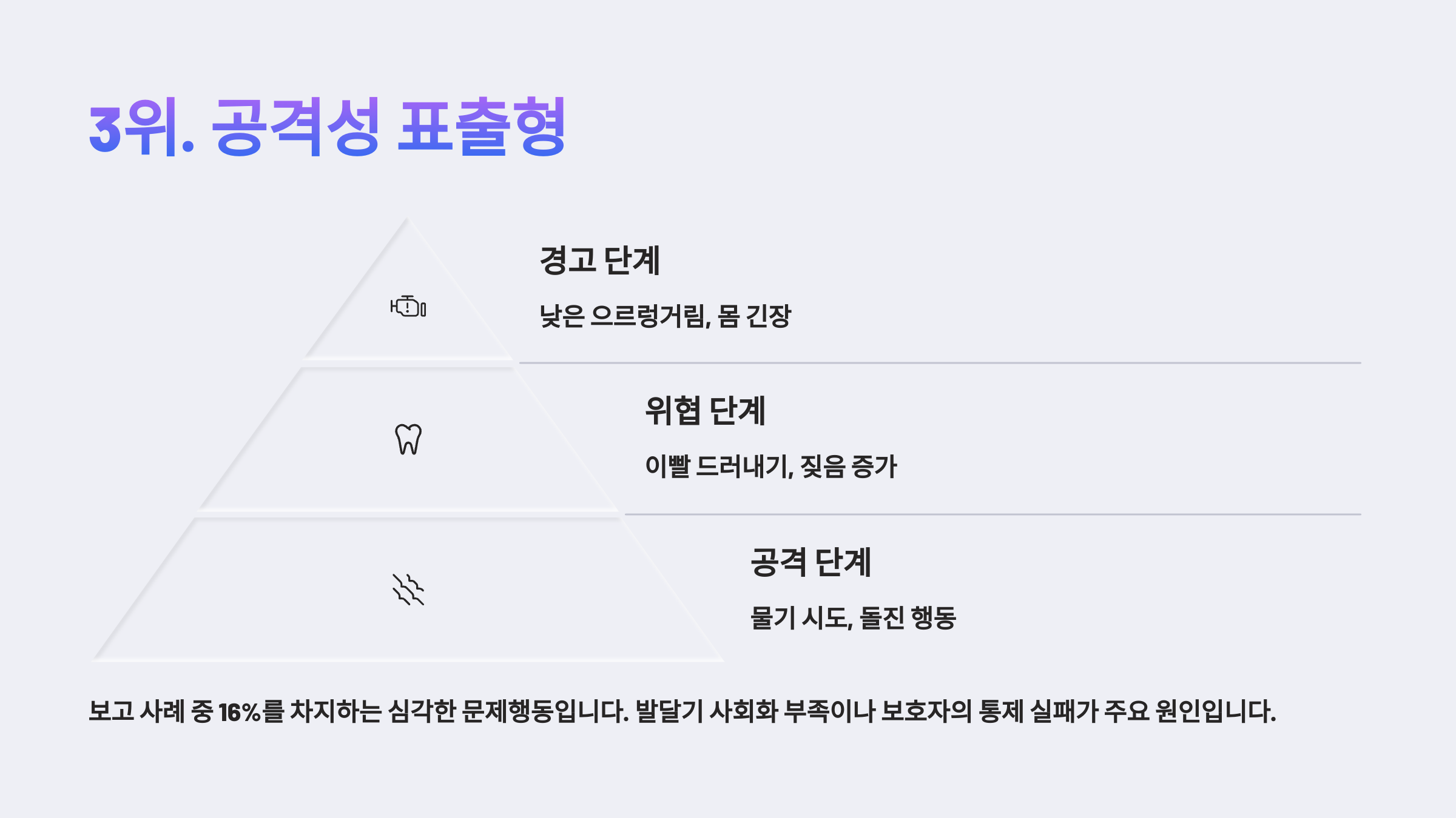 다음은 💥 3위. 공격성 표출형이에요. 무는 행동, 으르렁, 갑작스런 발톱질이 있다면 주목해 주세요! ⚡