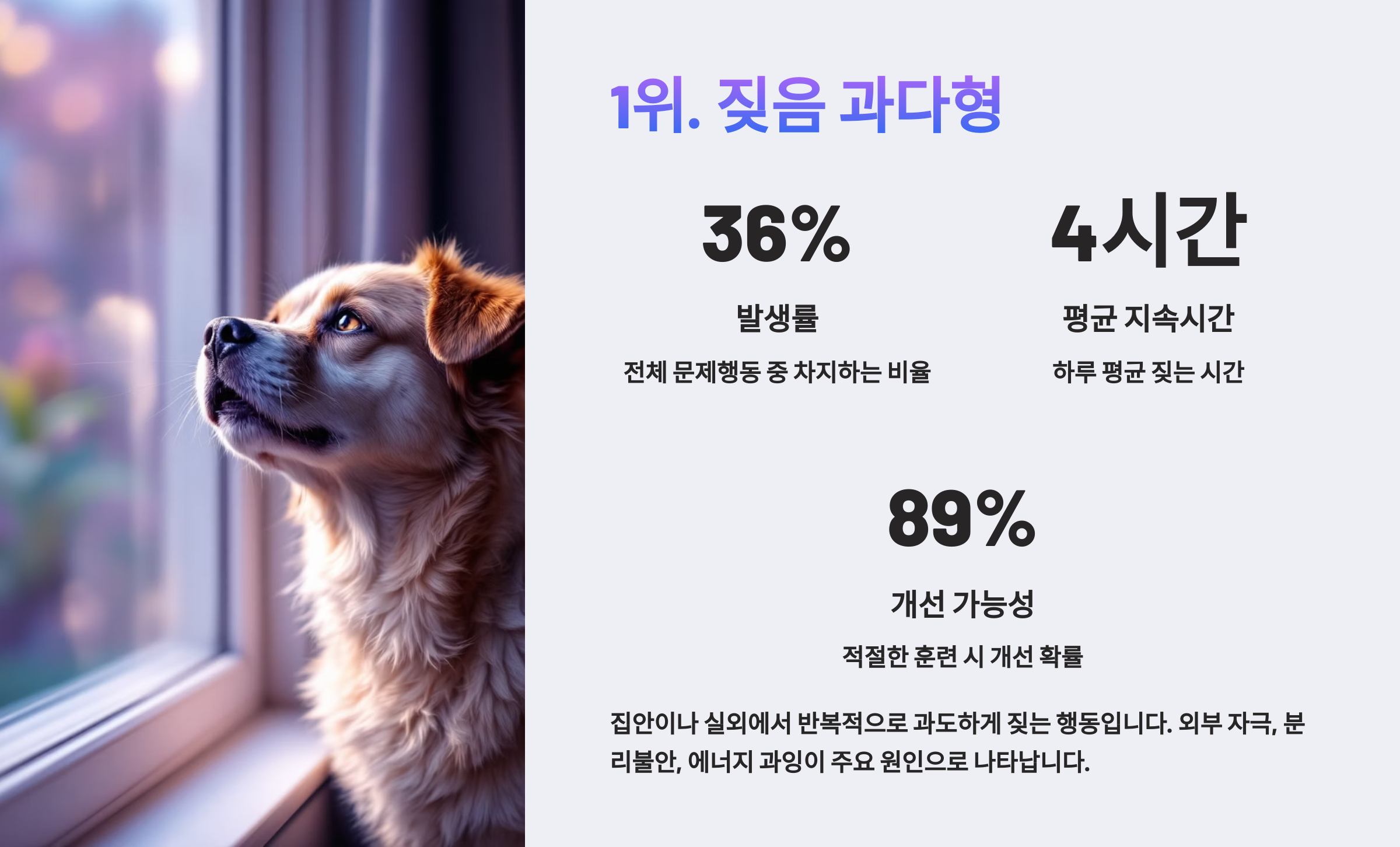 짖음이 너무 심해서 고민인 보호자분들 정말 많죠. 하루 종일 창문만 보면 짖고, 사람이 지나가도 짖고, 방문객만 오면 폭풍 짖음이 터지는 아이들! 이런 강아지들은 ‘짖음 과다형’ 문제행동 1위에 해당돼요. 📣