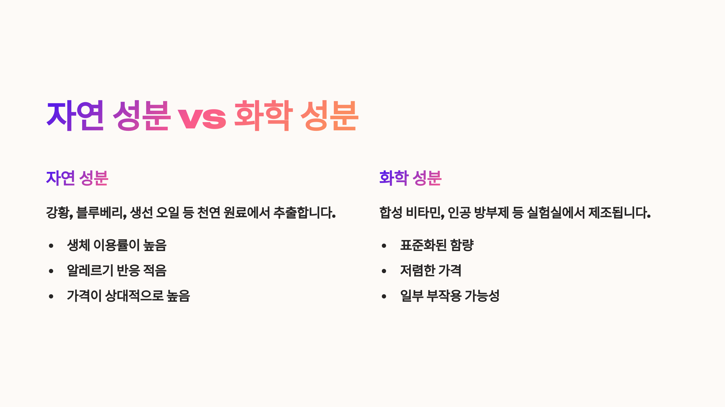 | 자연 성분 | 자연에서 추출된 재료 | 부작용이 적고, 흡수율이 좋음 | 효과가 느리게 나타날 수 있음 |