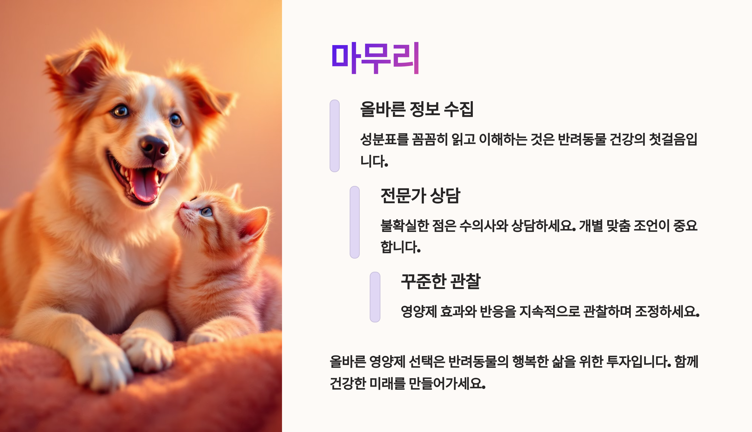 반려동물의 건강을 지키는 가장 중요한 것은 적절한 영양을 공급하는 것이에요. 영양제를 잘 활용하면, 강아지와 고양이가 더 오래, 건강하게 지낼 수 있어요. 이제 성분표를 쉽게 읽고, 반려동물에게 맞는 영양제를 선택하여, 그들의 건강을 챙기세요! 🐕💖