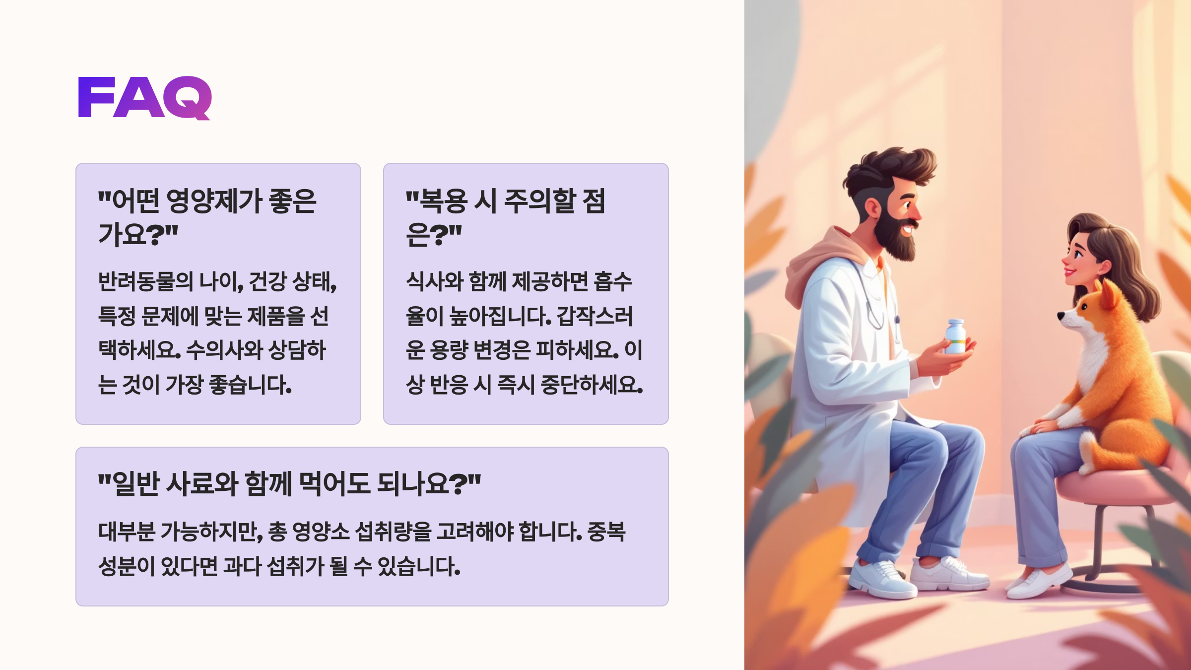 항상 반려동물의 건강을 최우선으로 생각하며 영양제를 선택하세요. 🐾💪