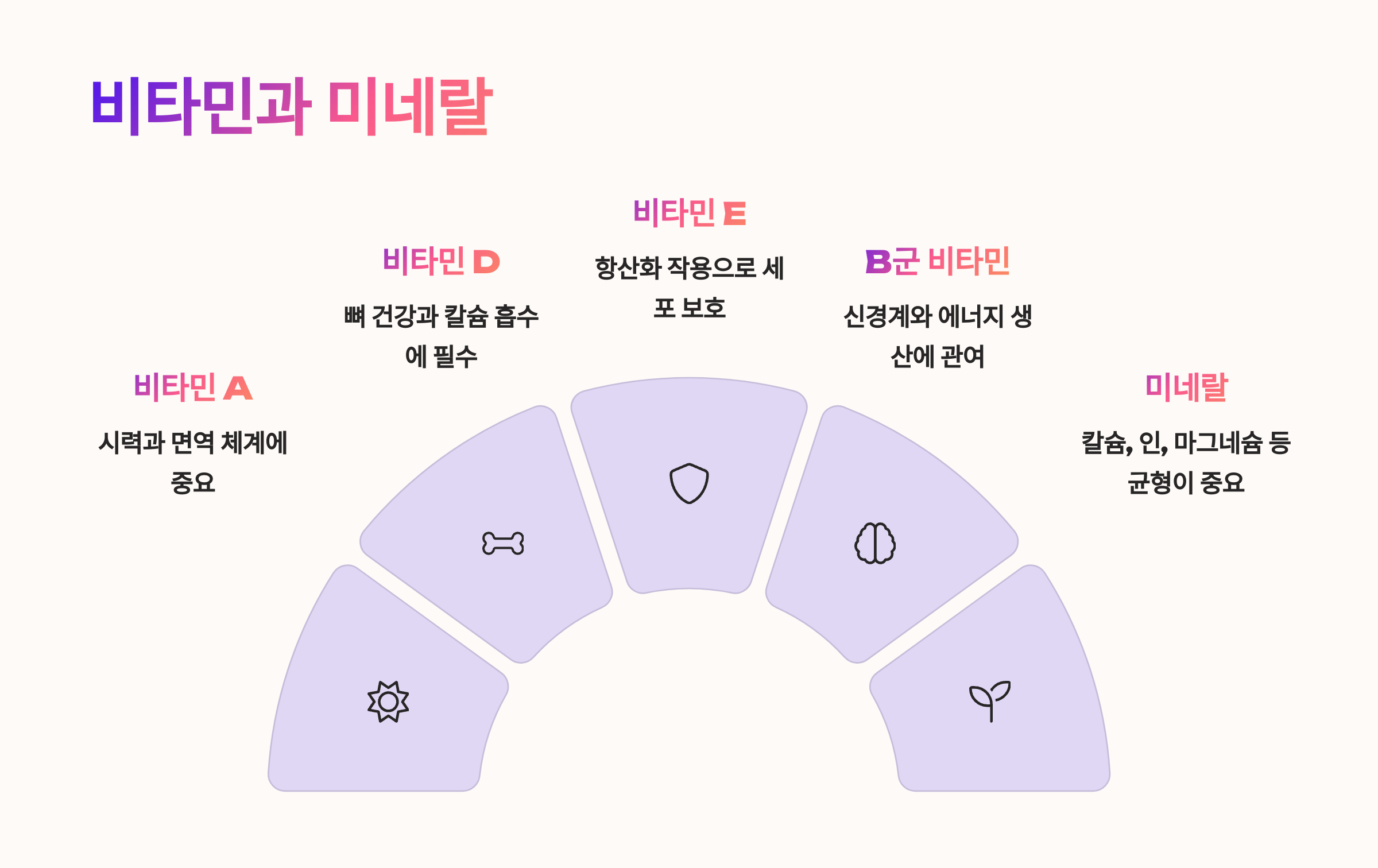 비타민은 신체의 여러 가지 기능을 돕고, 미네랄은 뼈와 근육을 건강하게 유지하는 데 필수적이에요. 이 두 성분은 반려동물의 전반적인 건강을 지키는 데 중요한 역할을 하죠! 🐾