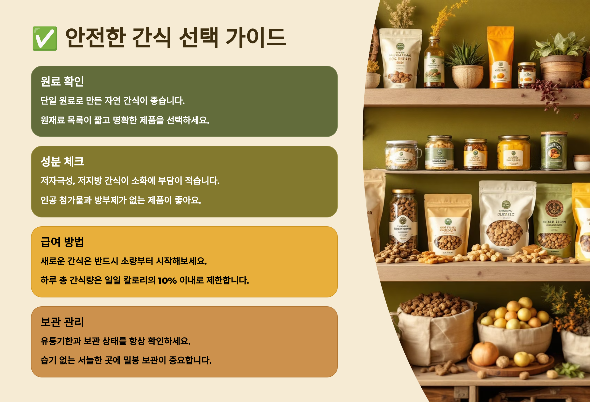 설사 경험 후 간식을 다시 선택할 때는 더욱 신중해야 해요. 가장 안전한 방법은 단일 원료로 만든 간식부터 시작하는 것이에요. 닭가슴살, 고구마, 당근 같은 단순한 재료로 만든 간식이 알레르기 반응을 일으킬 가능성이 낮아요. 복합 성분이 들어간 간식은 어떤 성분이 문제인지 파악하기 어렵거든요. 새로운 간식을 도입할 때는 3-5일 간격을 두고 한 번에 한 가지씩만 시도하는 것이 좋아요.