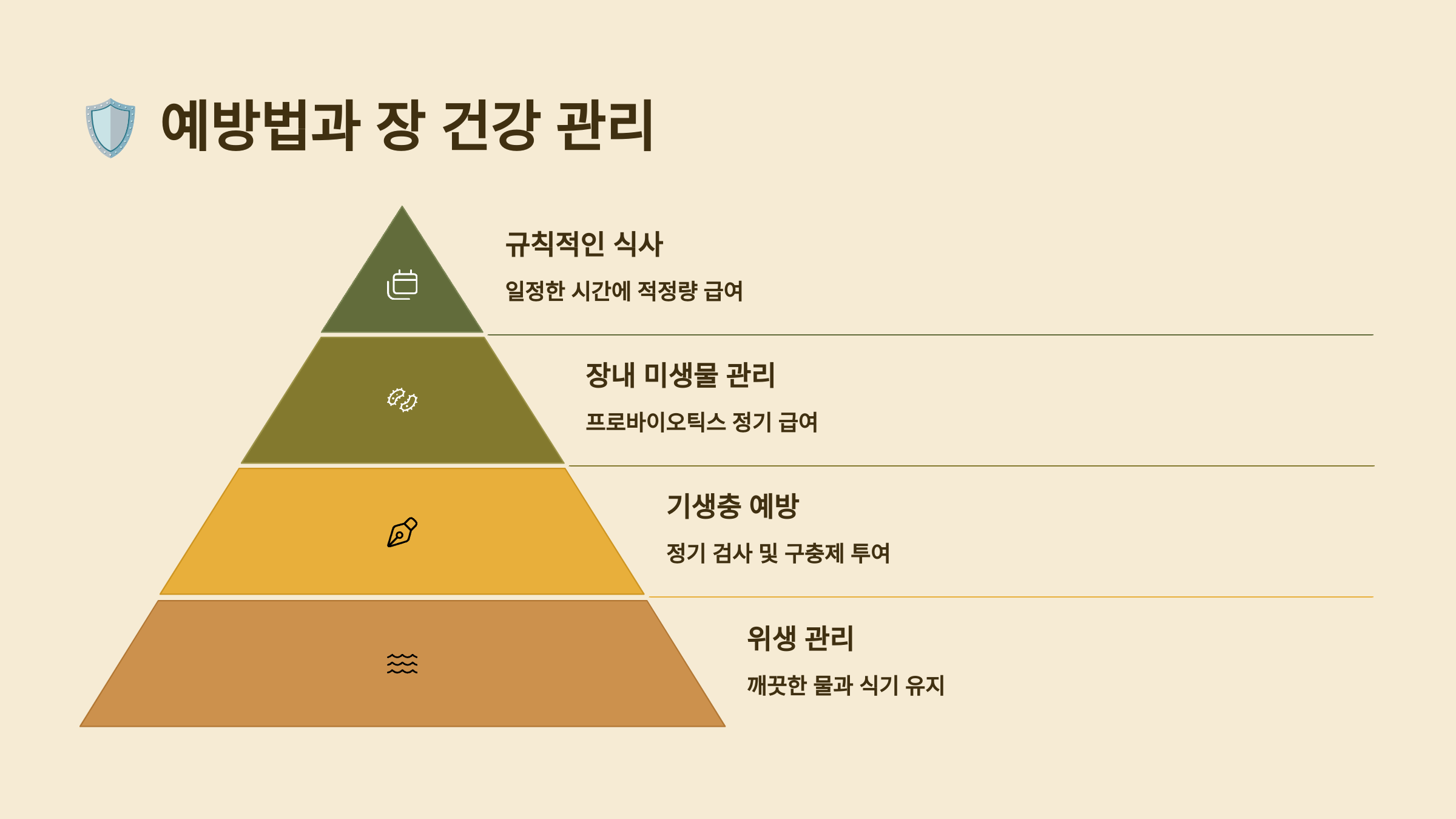 | 장내 환경 | 프로바이오틱스 | 주 2-3회 | 수의사 상담 |
