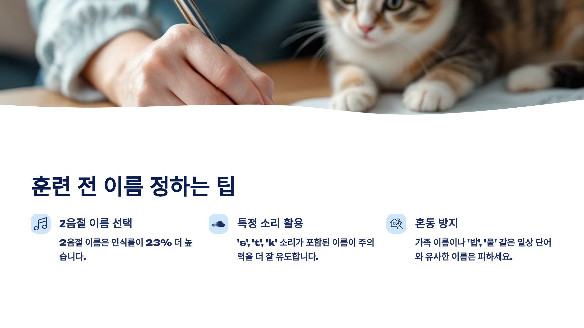 | ❌ 흔한 단어 피하기 | 명령어와 헷갈리는 이름 금지 | “앉아”, “이리와” 등과 유사한 발음 피하기 |