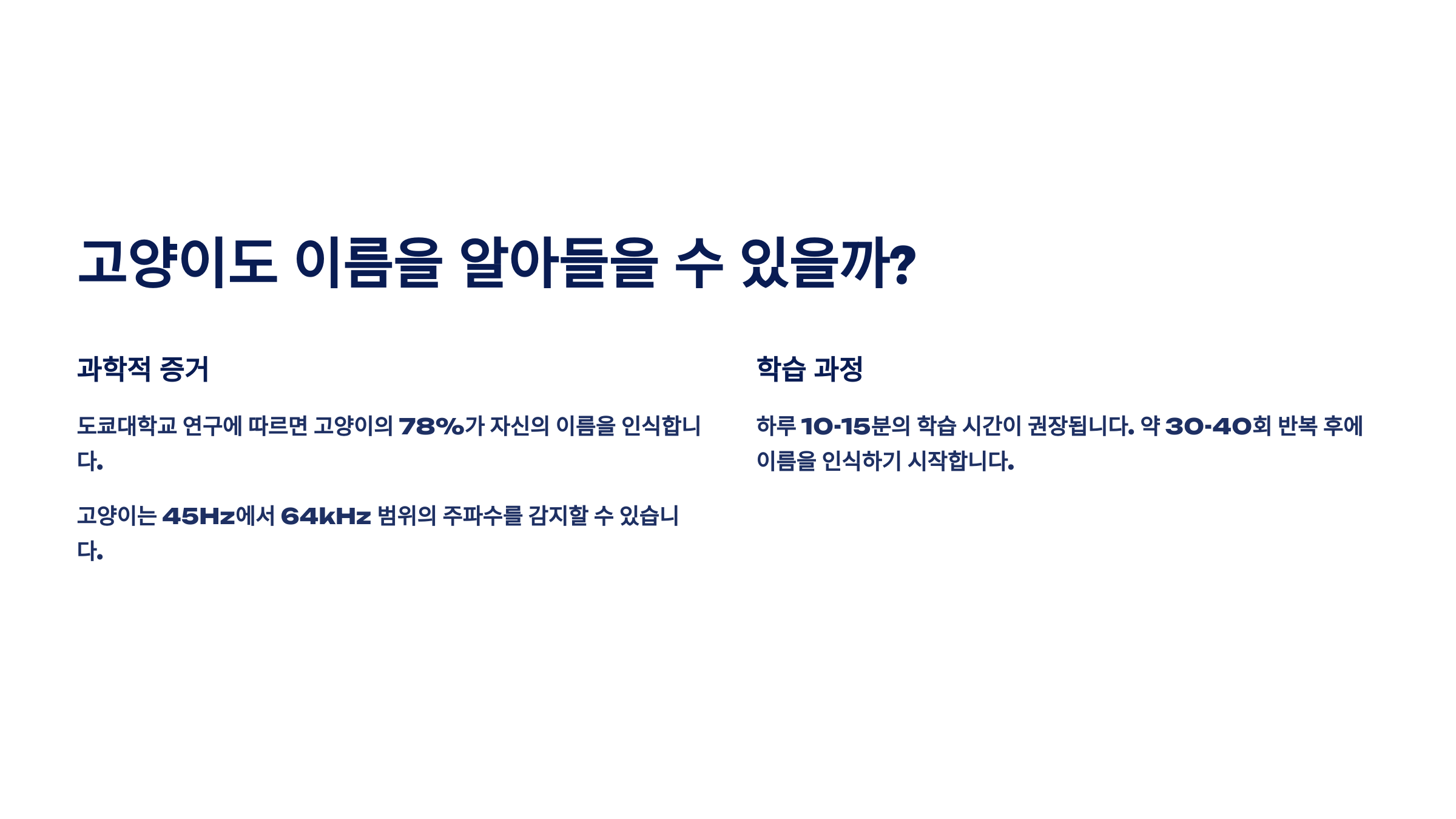 고양이는 긴 문장보다 짧고 명확한 음절에 더 빠르게 반응해요. 그래서 이름은 두 음절 이하가 가장 이상적이에요. 예: “미미”, “콩이”, “나비”, “모찌” 🐾