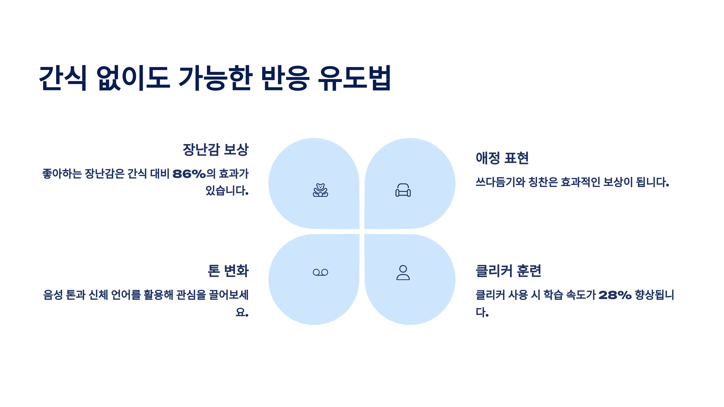 또한 간식은 사용 타이밍이 늦으면 효과가 떨어지기 때문에, 즉시 반응을 보상해줄 수 있는 비간식 보상을 병행하는 게 좋아요. 소리에 반응 → 바로 칭찬 or 손으로 토닥 → 장난감 등장! 이런 루틴이 효과적이에요.