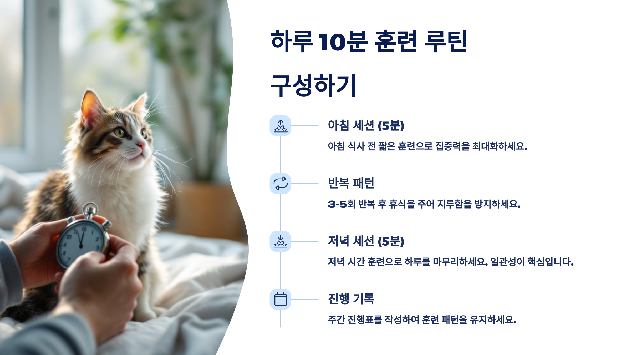 다음은 이 자극들을 하루 10분 루틴으로 구성하는 방법을 알려줄게요! 꾸준함이 고양이 훈련의 핵심이에요. ⏱