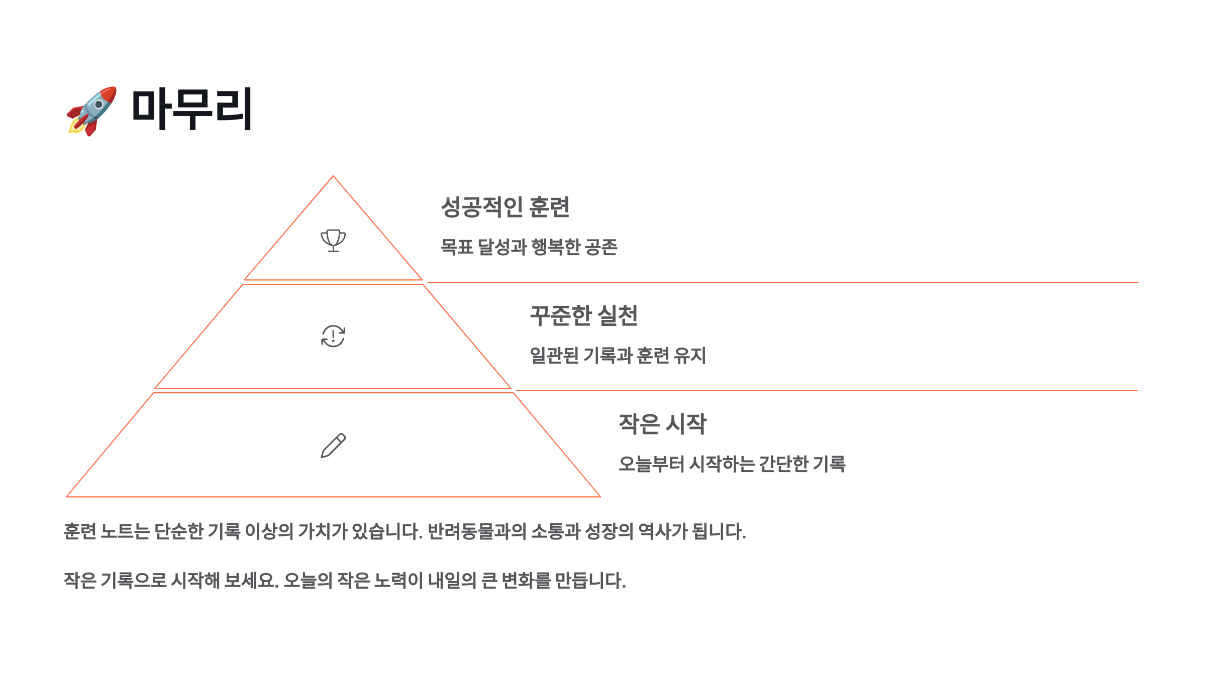 훈련 노트를 통해 쌓이는 긍정적인 경험과 기록들은 두 존재를 더욱 끈끈하게 연결해 줄 것입니다. 🤝