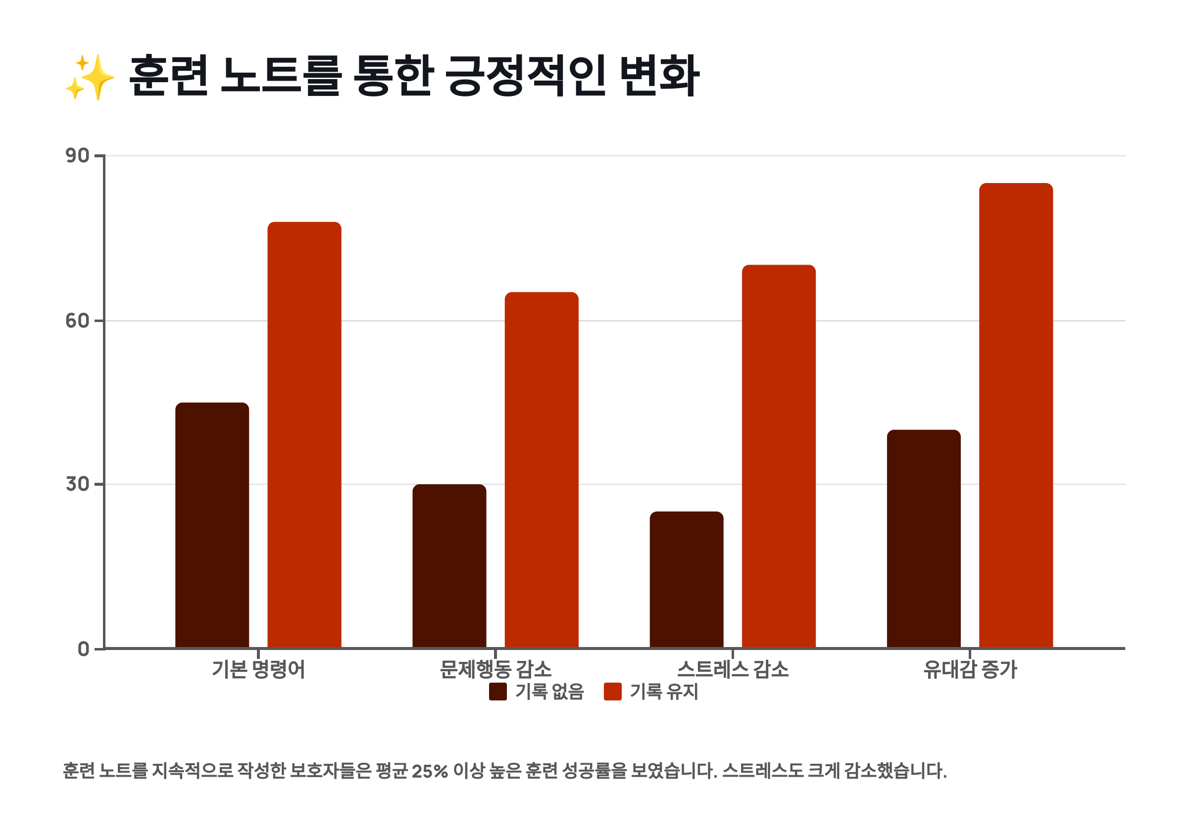 훈련 노트는 이러한 작은 성공들을 놓치지 않고 보호자에게 동기 부여를 해줍니다. "그래, 우리 아이는 발전하고 있어!" 라는 긍정적인 마음가짐이 중요합니다.