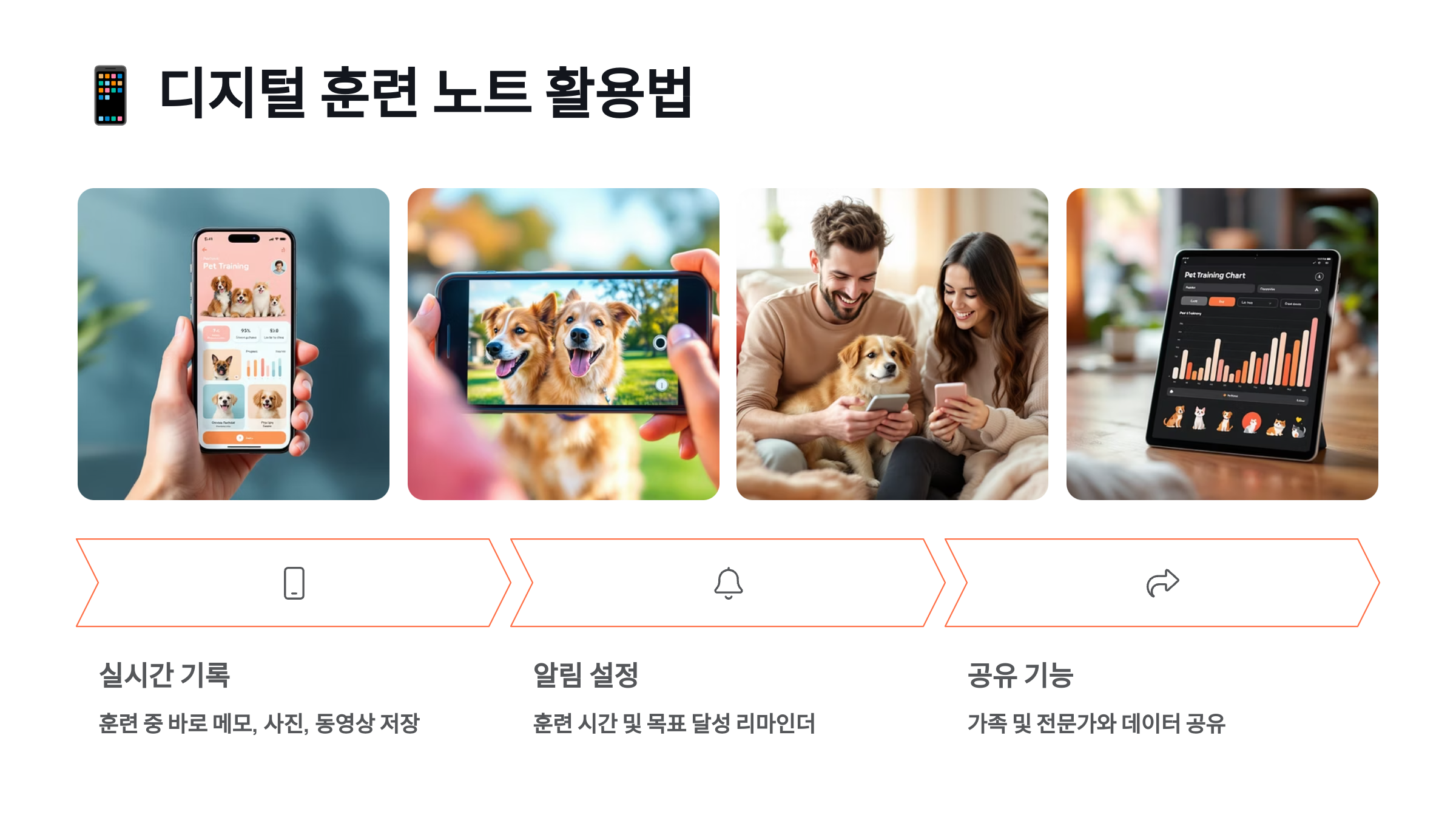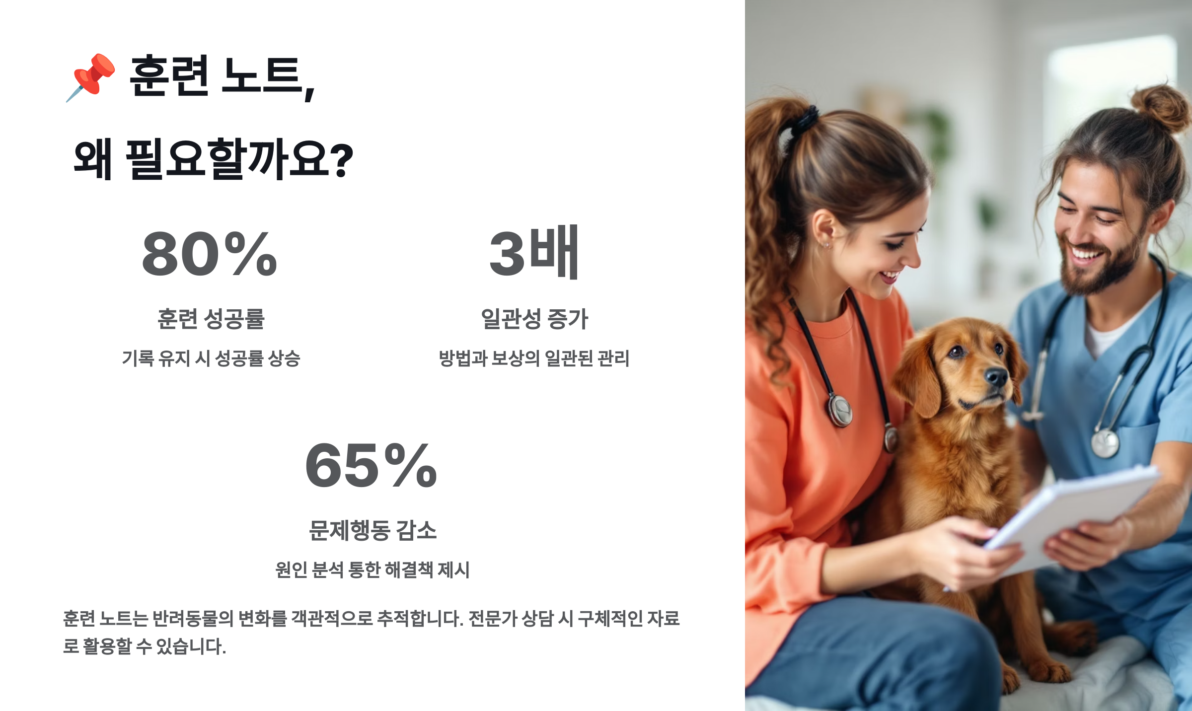 • 훈련 목표 달성 여부, 성공 횟수, 실패 횟수 등을 숫자로 기록합니다. (예: '앉아' 10회 중 8회 성공 (80%))