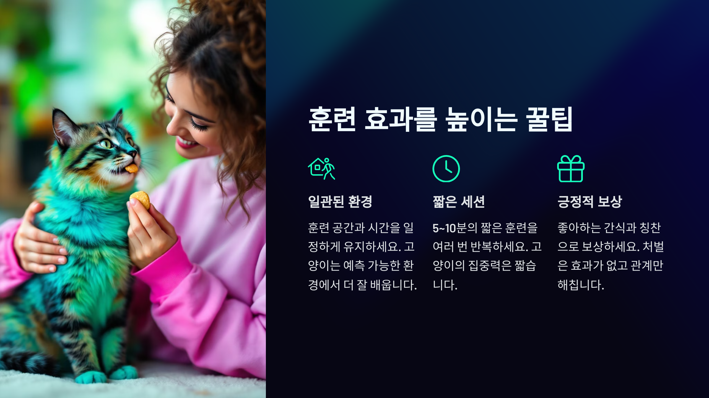 이 팁들을 함께 실천하면 훈련 효과가 훨씬 오래 지속되고, 고양이도 스트레스 없이 편안하게 변화할 수 있어요. 🐈⬛💕