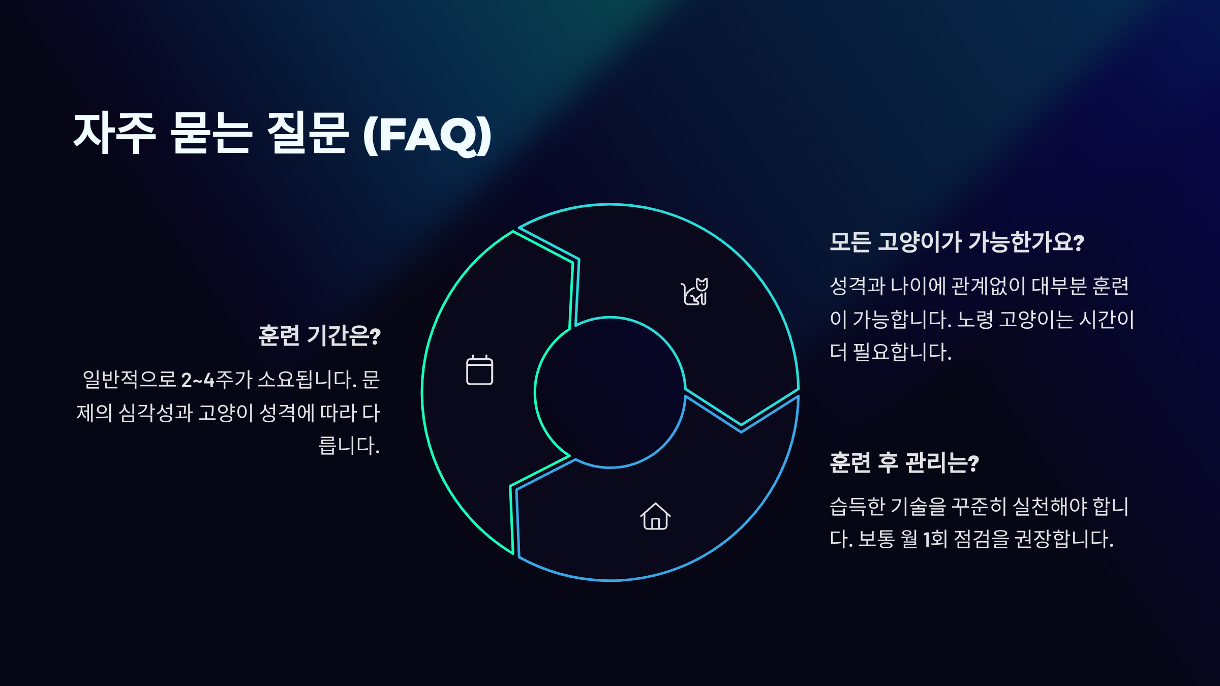A3. 고양이마다 성향은 다르지만, 대부분은 긍정적인 변화를 보였어요. 다만 인내심과 일관성이 가장 중요해요.