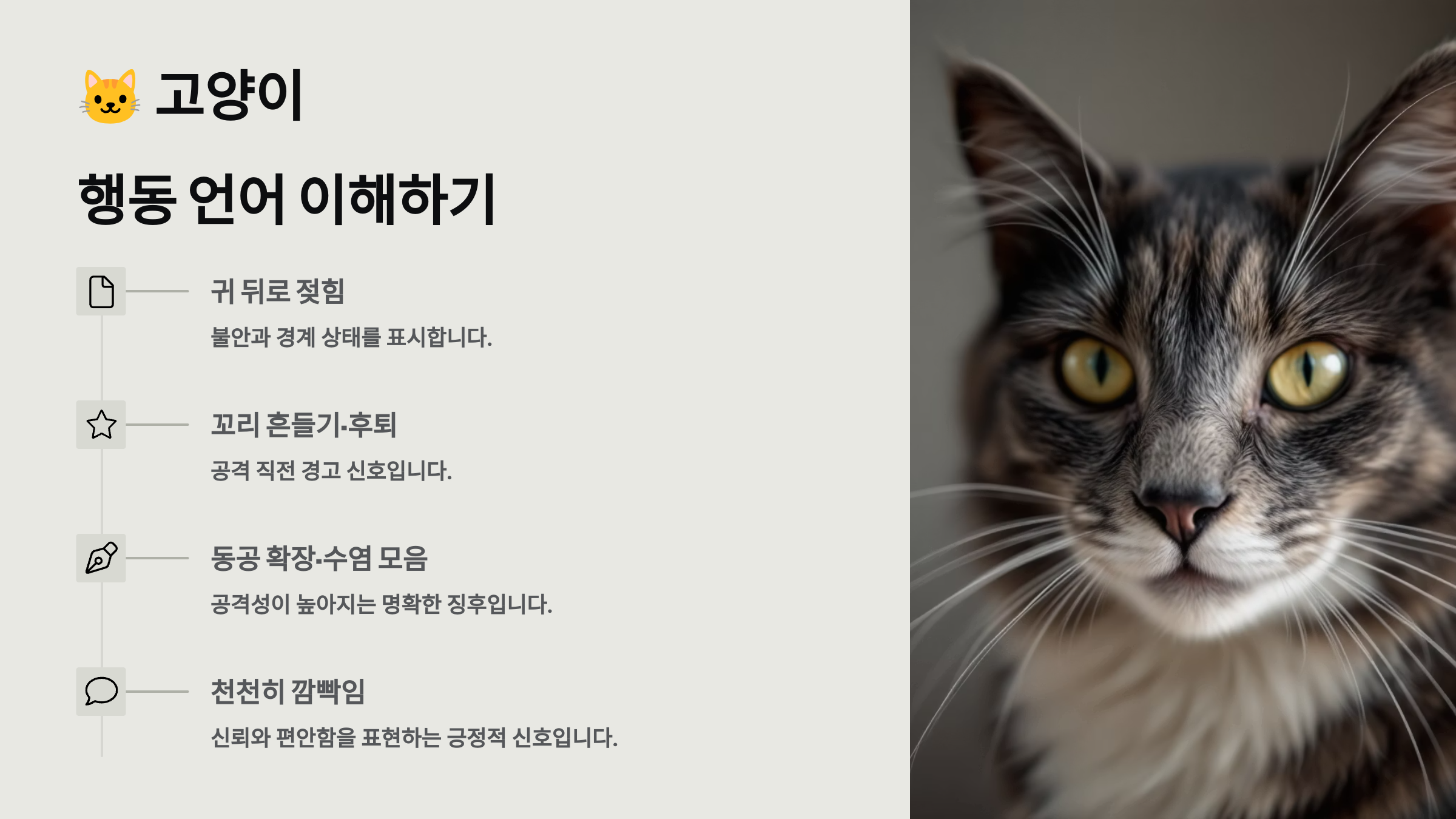 고양이의 행동 언어를 정확히 이해하는 것은 성공적인 교정의 핵심이에요. 고양이들은 다양한 신체 언어와 소리를 통해 자신의 감정과 의도를 표현하는데, 이를 올바르게 해석할 수 있어야 적절한 대응이 가능해요. 꼬리의 움직임은 가장 명확한 감정 표현 수단 중 하나랍니다. 꼬리를 높이 세우고 있을 때는 자신감과 만족감을 나타내고, 좌우로 빠르게 흔들 때는 흥분이나 짜증을 의미해요.
