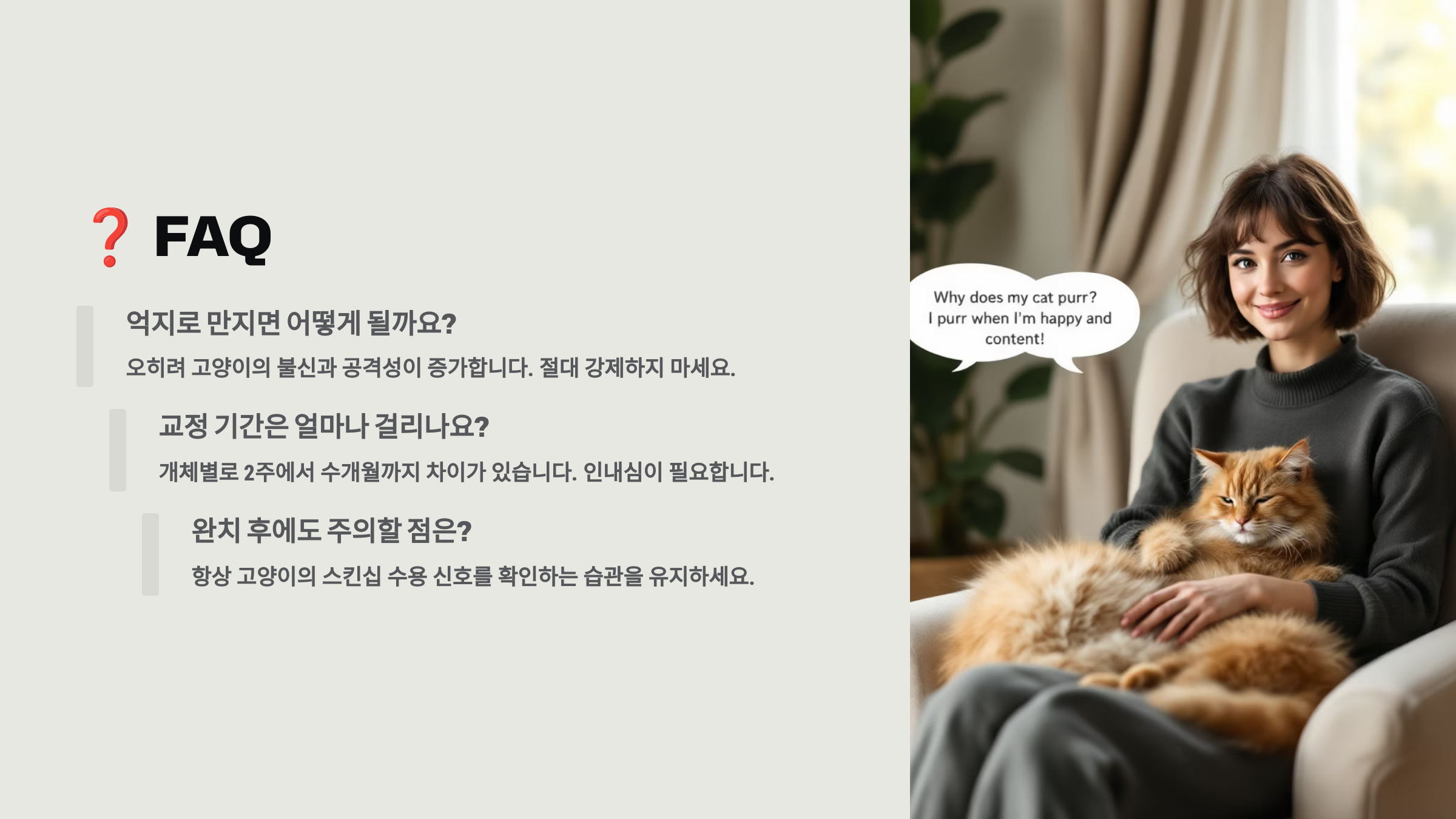 이런 신호들을 종합적으로 관찰하면 고양이의 현재 감정 상태를 정확히 파악할 수 있어요. 감정 상태에 따라 접근 방법을 달리하는 것이 성공적인 교정의 비결이랍니다. 😺