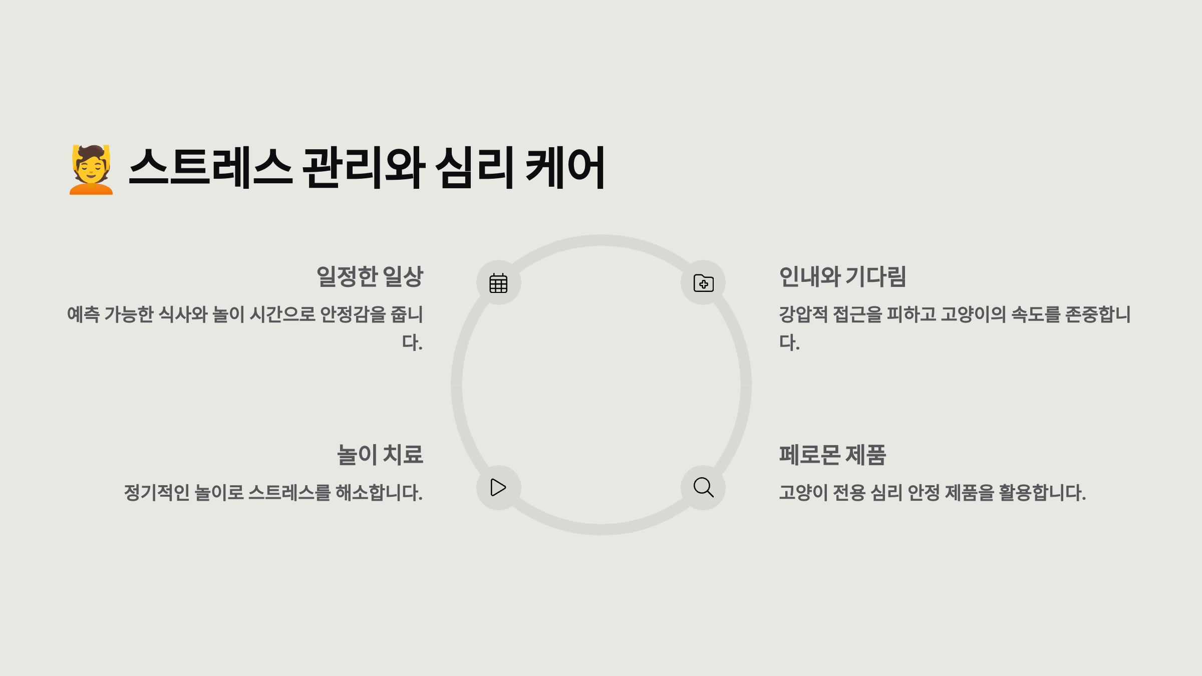 여러 방법을 조합해서 사용하면 더욱 효과적인 스트레스 관리가 가능해요. 고양이의 성향과 상황에 맞는 방법을 선택하는 것이 중요하답니다. 💆