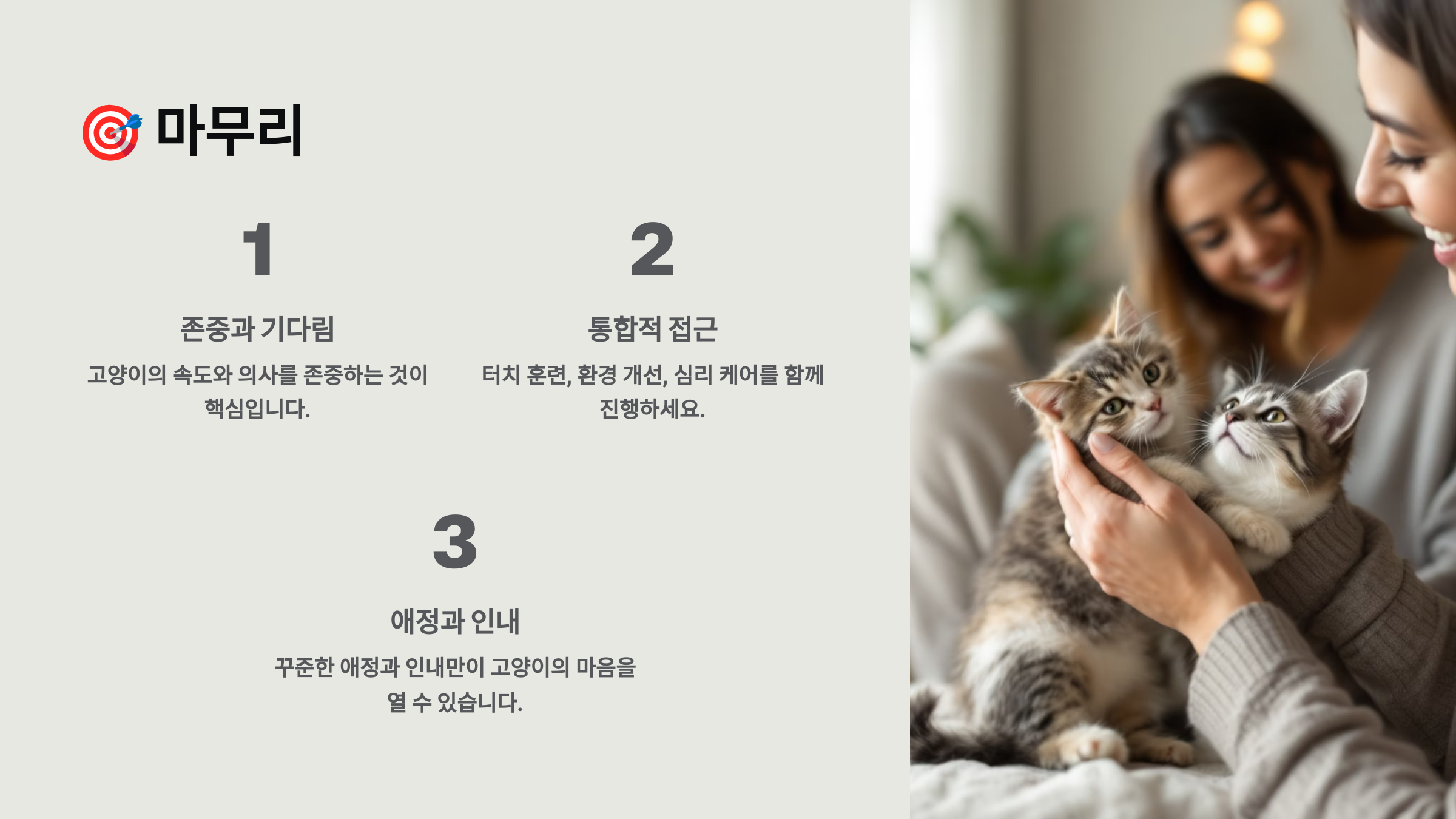 각 단계별로 충분한 시간을 두고 진행하면 확실한 변화를 볼 수 있어요. 무엇보다 고양이의 속도에 맞춰서 인내심을 갖고 기다려주는 것이 중요하답니다. ✋