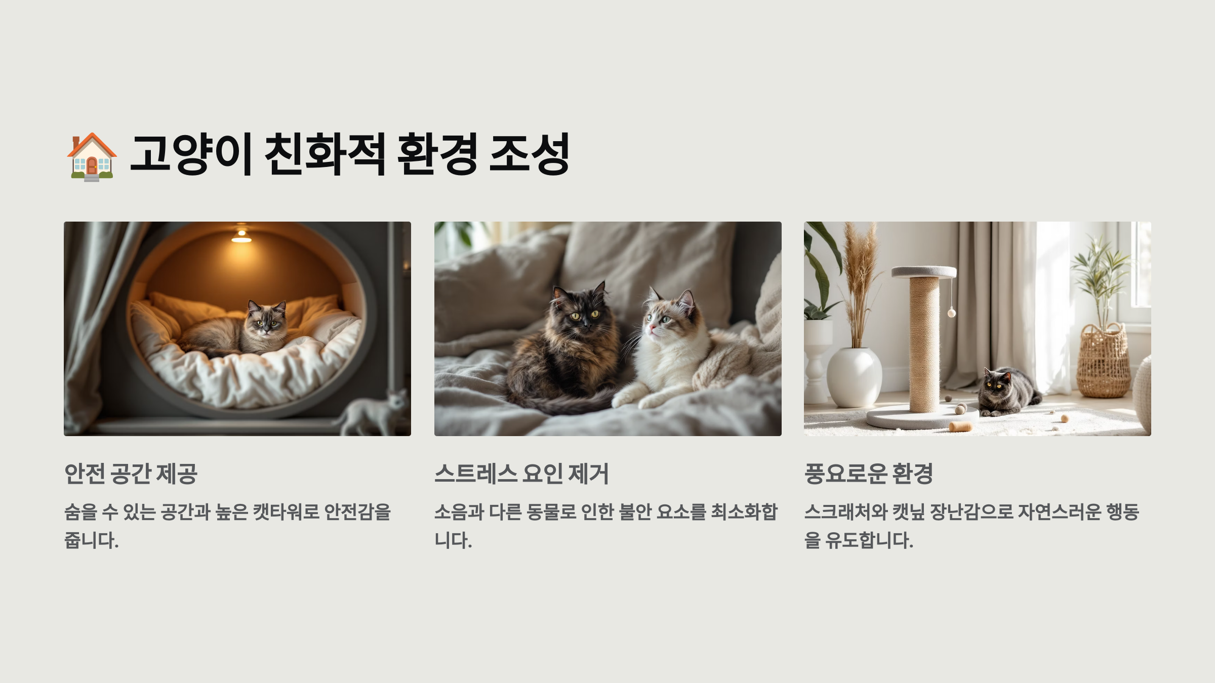 이런 환경적 요소들을 모두 고려해서 고양이가 편안하게 지낼 수 있는 공간을 만들어주면 자연스럽게 스트레스가 줄어들고 사람에 대한 경계심도 완화될 수 있어요. 🏠