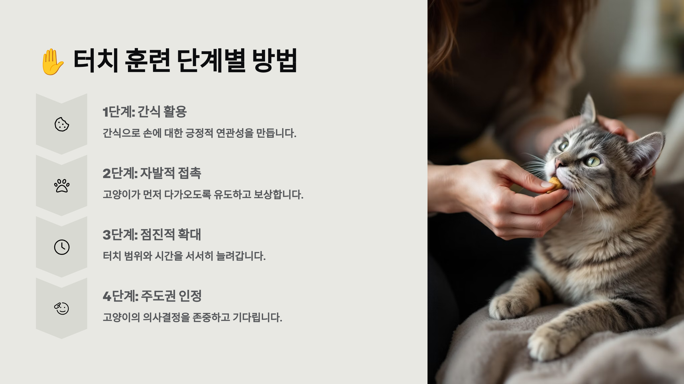 터치 훈련은 단계적이고 점진적인 접근이 핵심이에요. 첫 번째 단계는 간접적인 접촉부터 시작하는 거예요. 직접 손으로 만지기보다는 깃털 장난감이나 긴 막대 끝에 달린 장난감을 이용해서 고양이가 사람의 움직임에 익숙해지도록 도와주세요. 이 과정에서 고양이가 긴장하지 않고 놀이로 인식할 수 있도록 즐거운 분위기를 만드는 것이 중요해요. 고양이가 장난감과의 상호작용에 편안함을 느끼기 시작하면 다음 단계로 넘어갈 준비가 된 거예요.