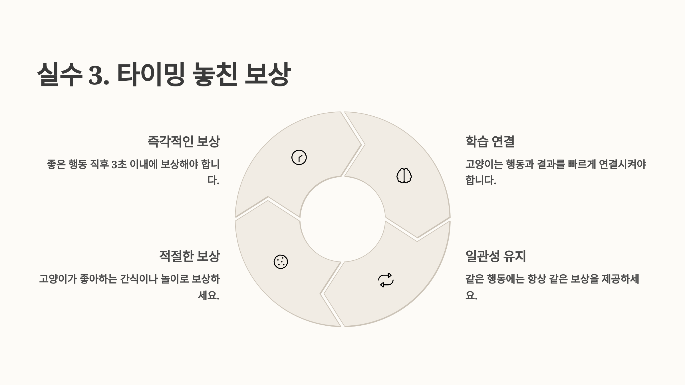 고양이에게 보상을 줄 때 가장 중요한 건 “타이밍”이에요. 행동 직후 1~2초 이내에 보상이 이뤄지지 않으면, 고양이는 무엇 때문에 간식을 받았는지 전혀 연결하지 못해요. 😵