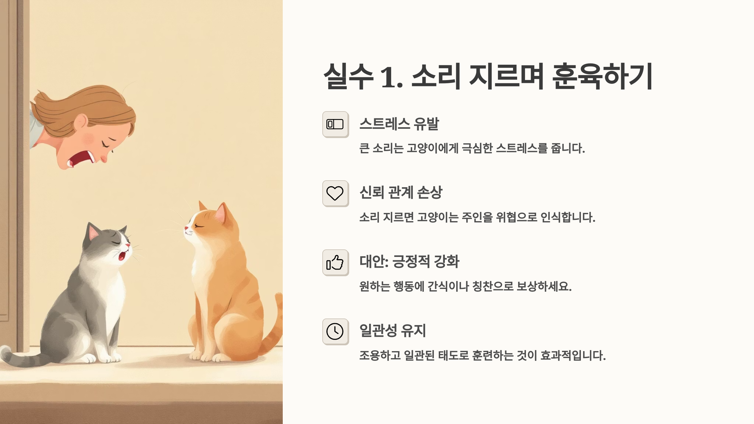 이제 고양이의 행동 원리를 이해했으니, 다음은 고양이가 싫어하는 훈련 실수를 하나하나 살펴볼 차례예요. 첫 번째 실수는 “❗ 소리 지르며 훈육하기”입니다. 👇