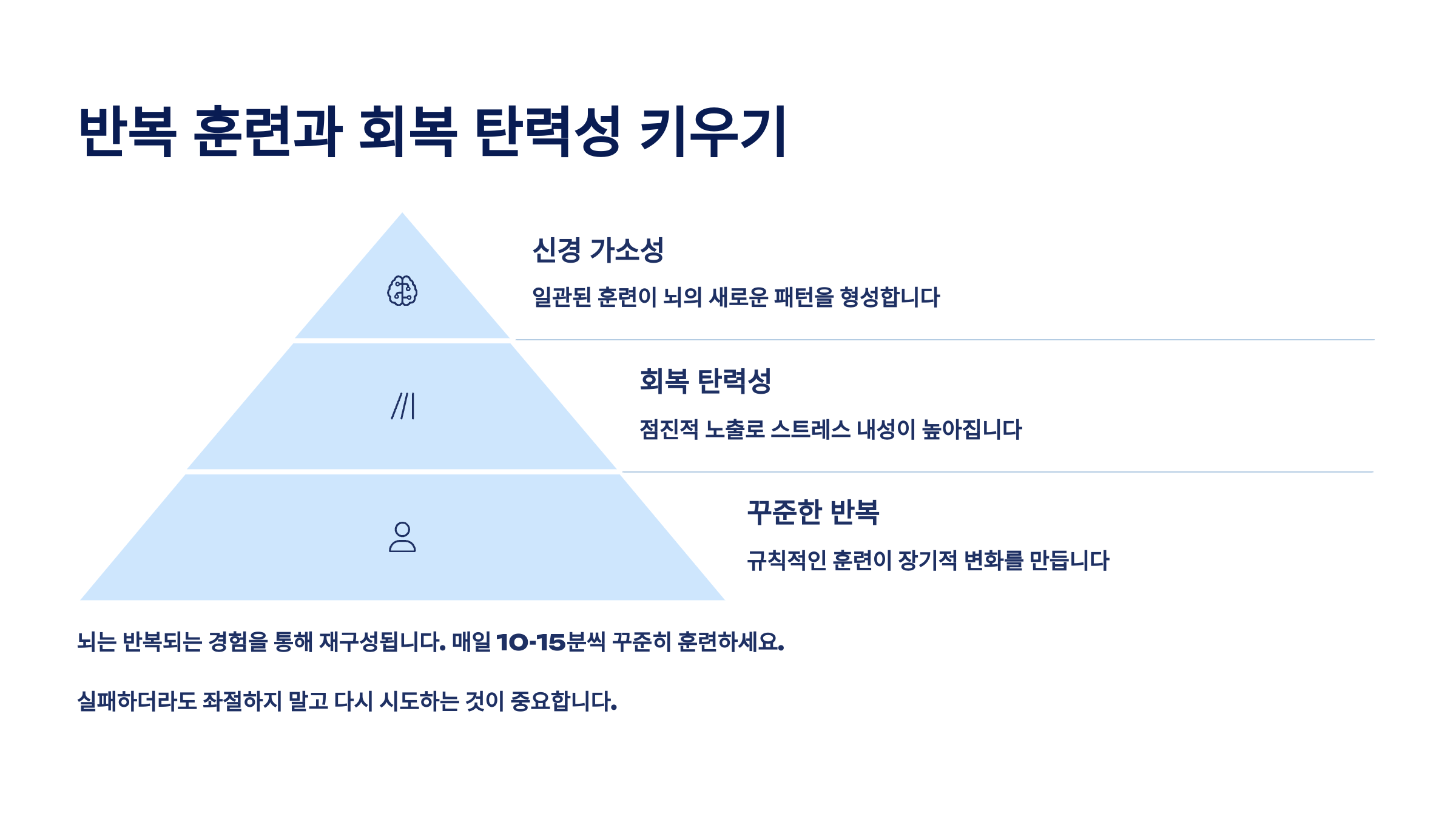 이제 실전까지 마친 우리는, 그 효과를 안정적으로 만들기 위해 훈련 반복과 회복 탄력성에 집중할 차례예요. 바로 다음은 🔁 반복 훈련과 회복 탄력성 키우기예요!