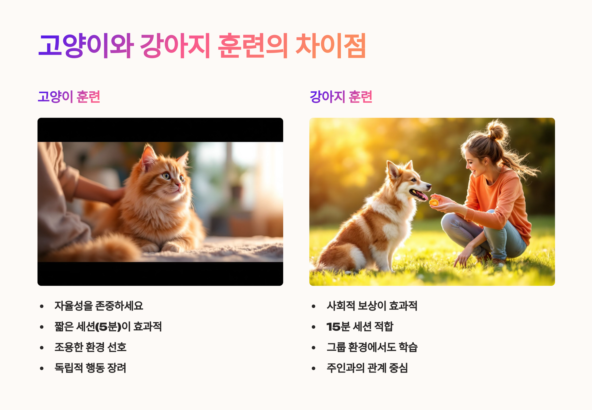 강아지와 고양이는 생물학적으로도, 성격적으로도 아주 달라요. 강아지는 집단 생활에 익숙한 동물이라 보호자와의 관계를 통해 훈련에 잘 반응하지만, 고양이는 독립적인 습성이 강한 동물이라서 훈련 자체에 거부감을 가질 수 있어요 🐶😼.