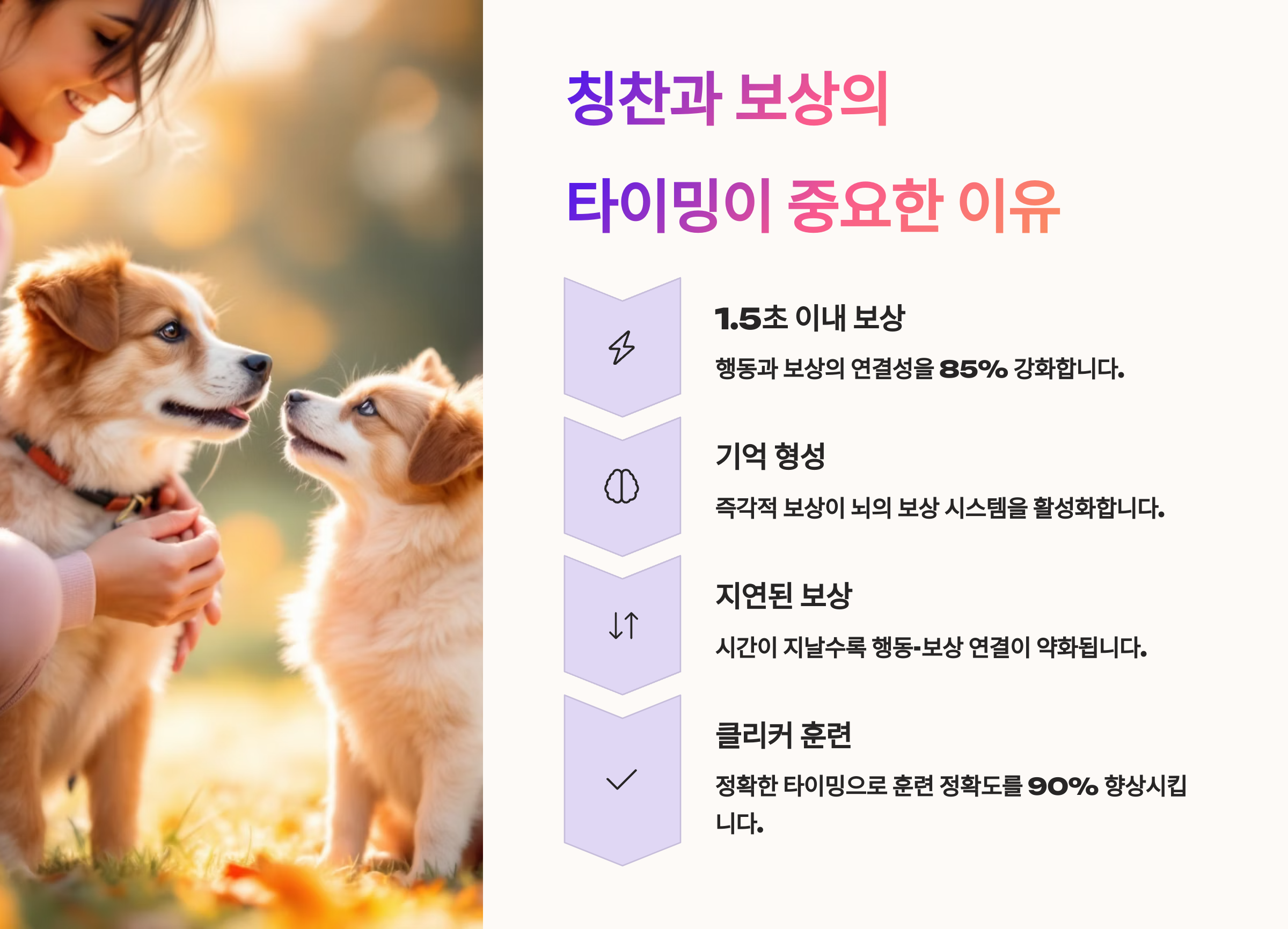 반려동물은 즉각적인 반응에 가장 잘 반응해요. 우리가 원하는 행동을 한 뒤 1~2초 안에 칭찬이나 보상을 주지 않으면, 그 행동과 보상이 연결되지 않아요. 예를 들어 강아지가 '앉아' 했을 때 간식을 꺼내느라 5초가 걸리면, 그 간식은 '앉기'에 대한 보상이 아니게 되는 거죠.