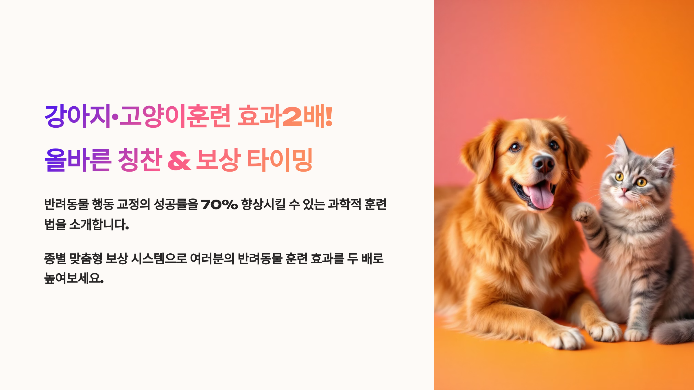 강아지와 고양이는 생물학적으로도, 성격적으로도 아주 달라요. 강아지는 집단 생활에 익숙한 동물이라 보호자와의 관계를 통해 훈련에 잘 반응하지만, 고양이는 독립적인 습성이 강한 동물이라서 훈련 자체에 거부감을 가질 수 있어요 🐶😼.