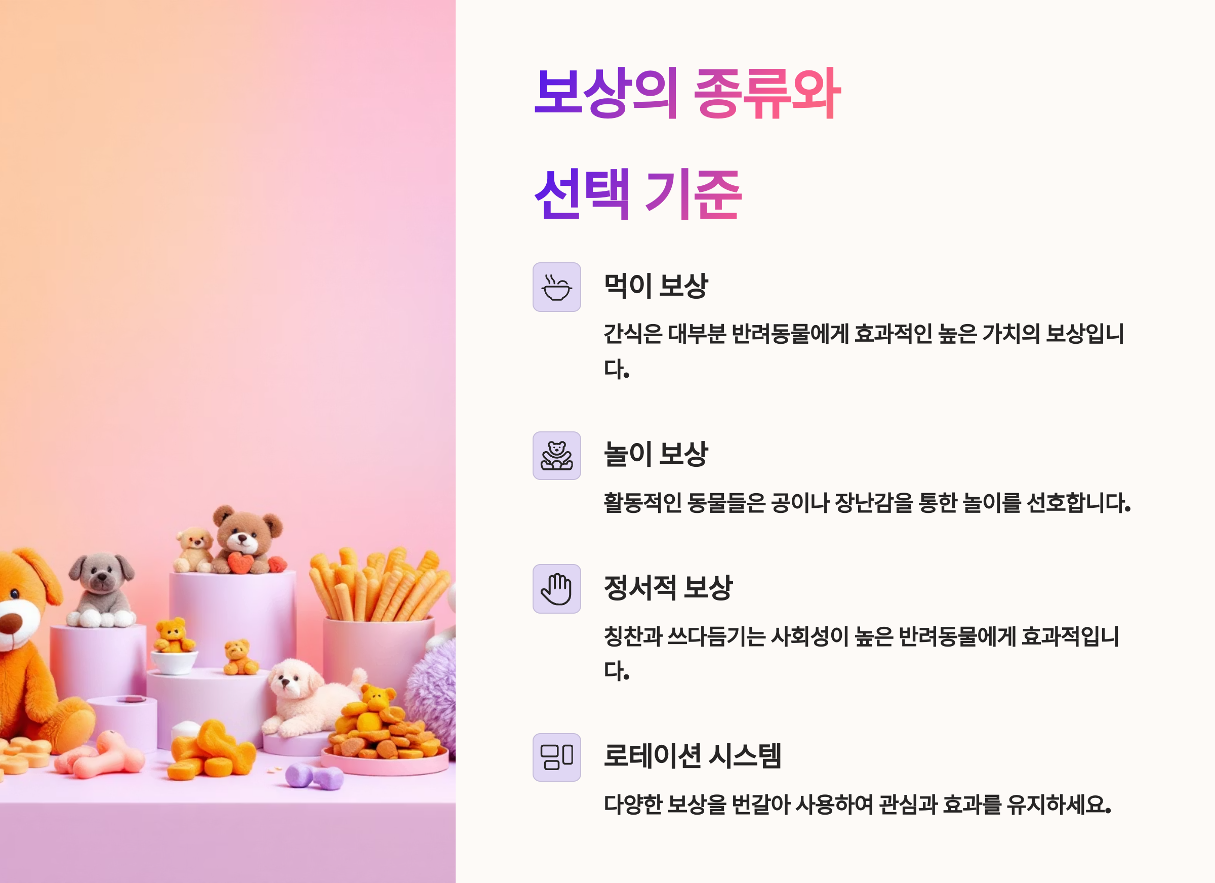 훈련에서 사용하는 보상은 크게 네 가지로 나눌 수 있어요. 간식, 장난감, 칭찬, 그리고 신체 접촉(쓰다듬기)예요. 이 중 어떤 보상이 효과적인지는 반려동물의 성향에 따라 달라져요. 어떤 아이는 간식을 좋아하고, 어떤 아이는 칭찬만으로도 행복해하거든요 🐾.
