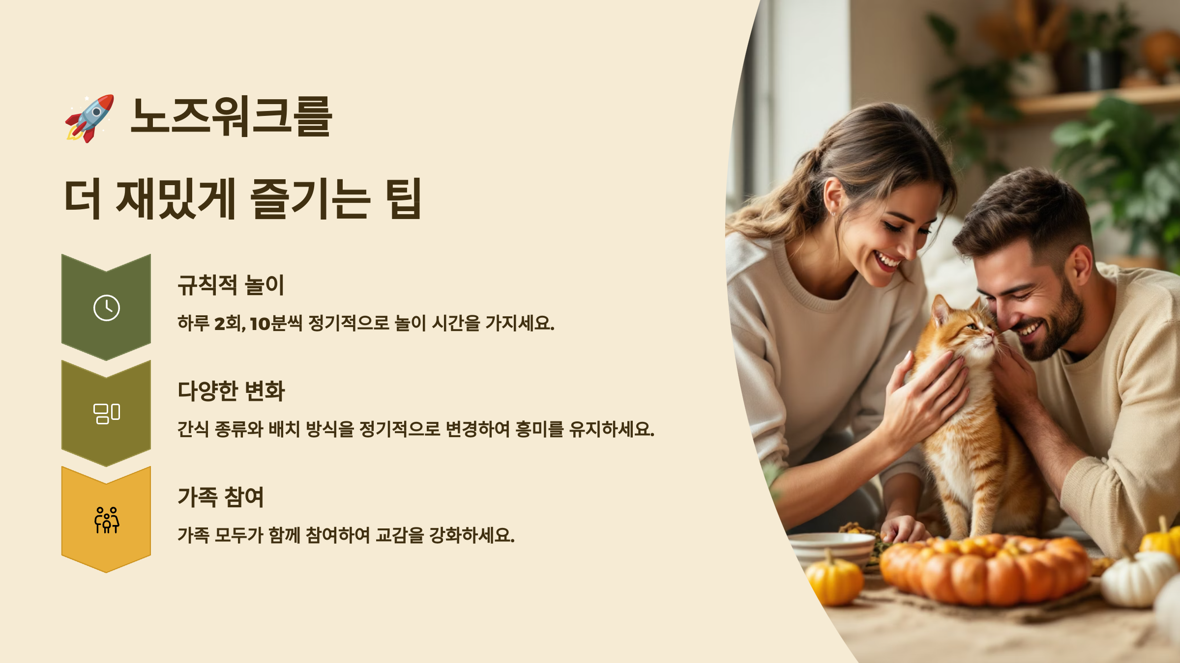 뿐만 아니라, 우울하거나 무기력한 고양이에게도 큰 자극이 돼요. 혼자 있는 시간이 많거나 새로운 자극이 필요한 아이들에게 적극 추천할 만한 놀이랍니다. 고양이의 삶에 활력을 불어넣어주는 아주 좋은 루틴이에요! 🌈🐾