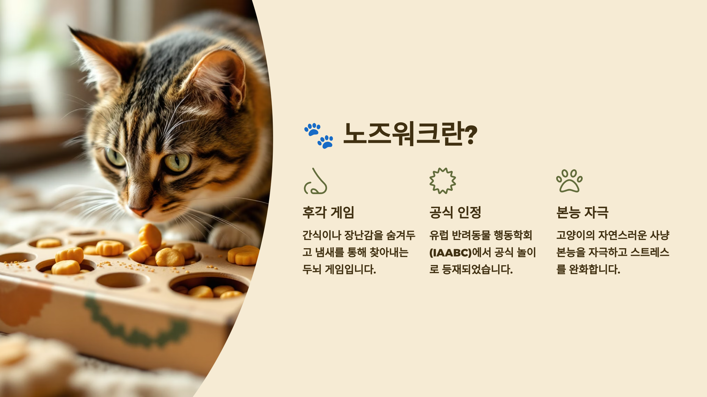 이번 글에서는 고양이도 즐길 수 있는 노즈워크의 세계에 대해 소개할게요. 노즈워크의 정의부터 시작해서, 왜 고양이에게 꼭 필요한 놀이인지, 집에서도 쉽게 실천할 수 있는 방법까지 꼼꼼하게 알려줄게요. 모두 따라오세요~!