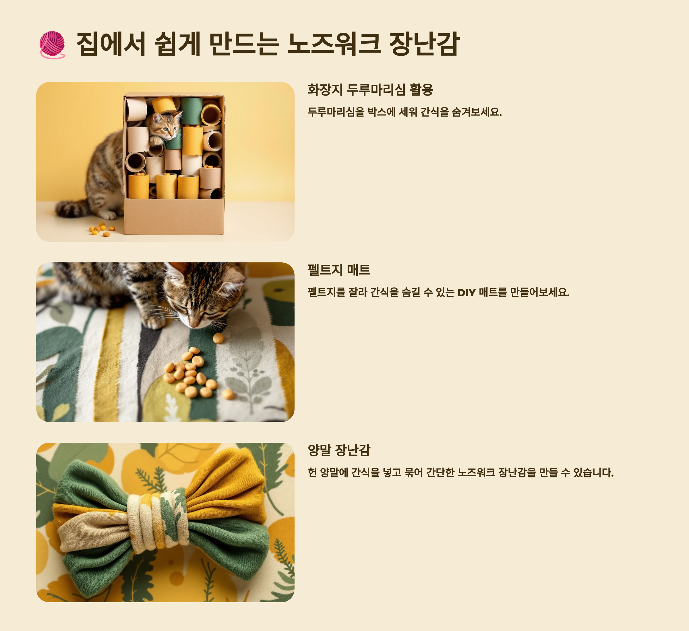고양이가 노즈워크에 익숙해졌다면, 다양한 재료와 환경을 활용해보는 것도 좋아요! 예를 들어, 종이 상자에 구멍을 내서 간식을 넣어두면 고양이는 더 창의적으로 움직이게 돼요. 환경이 바뀌면 놀이의 재미도 배가되죠! 📦🎉